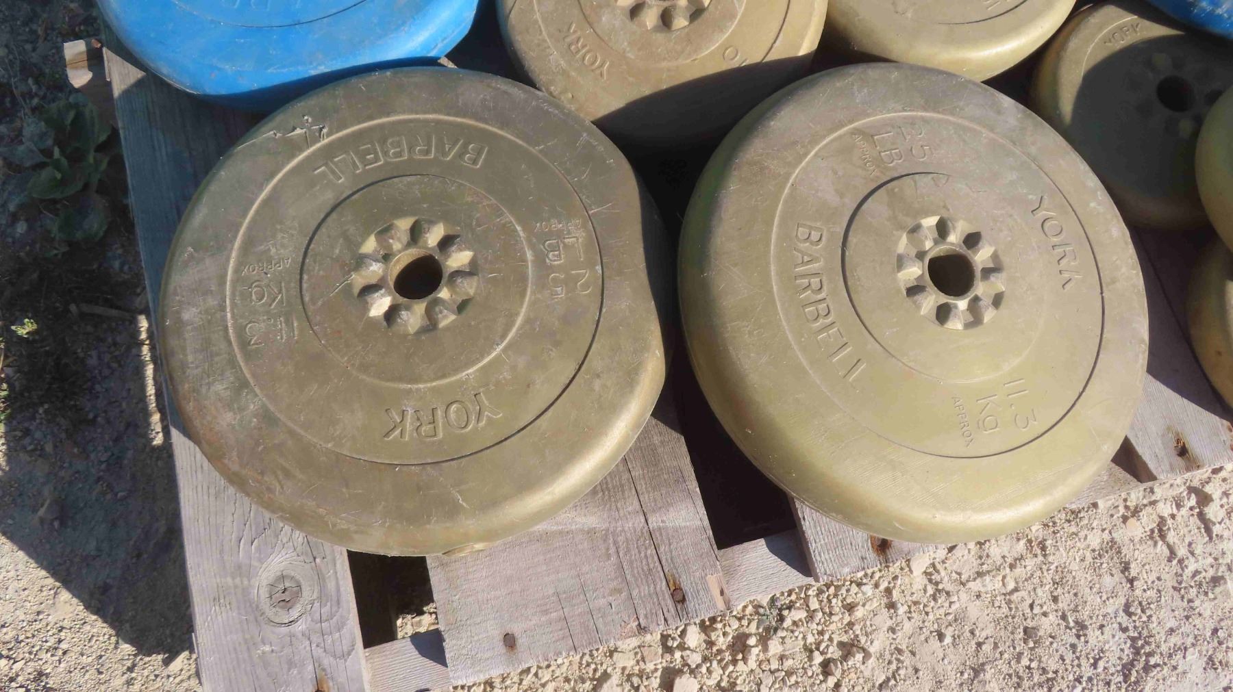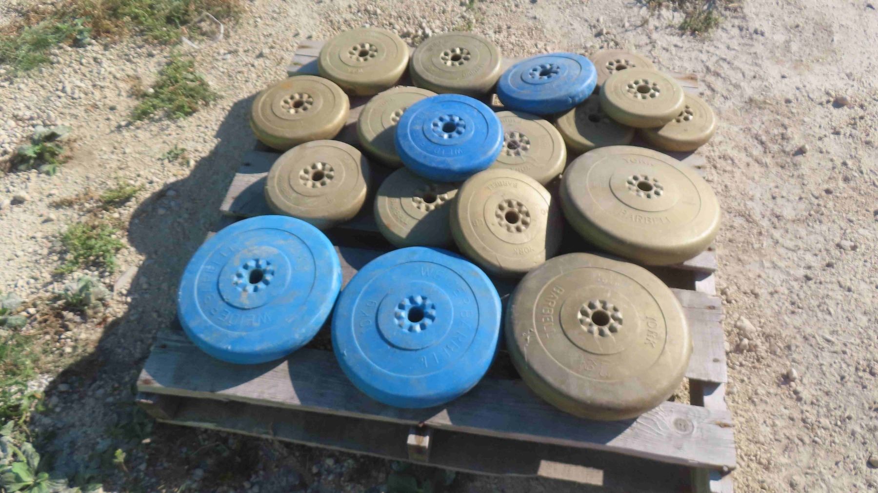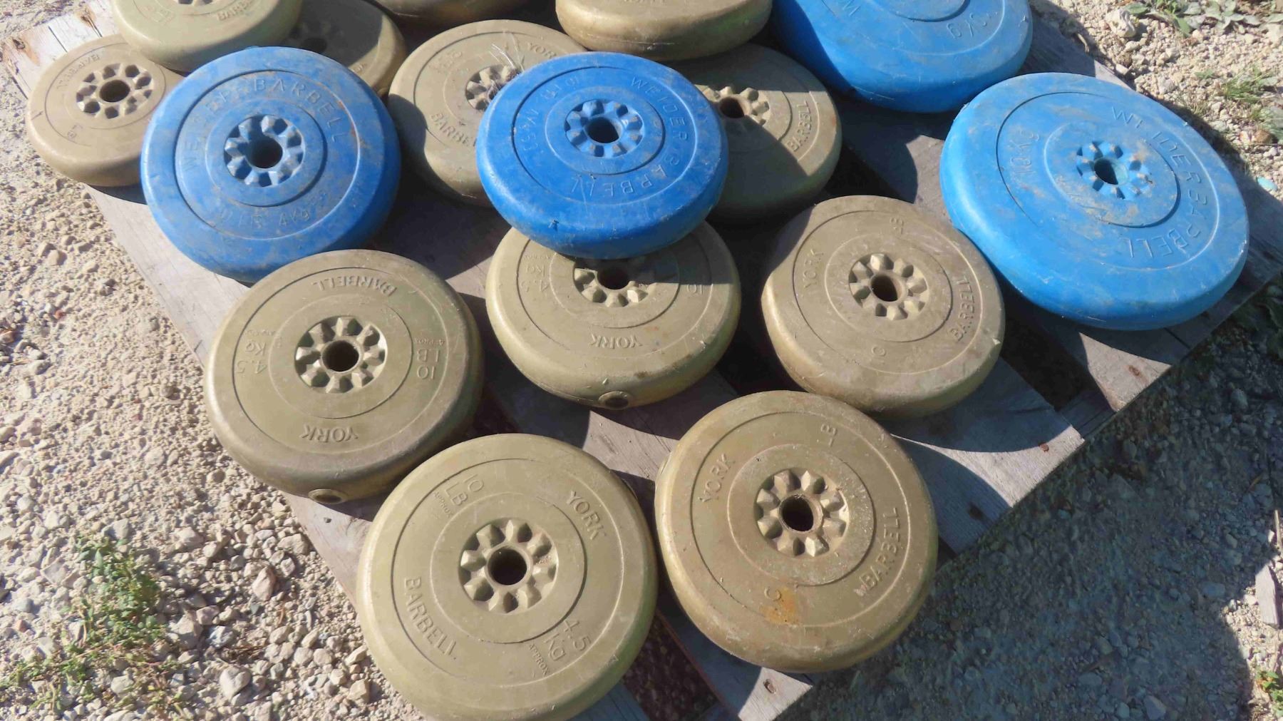 Pallet Lot: 18 Blue and Gold Weights 5-25lbs