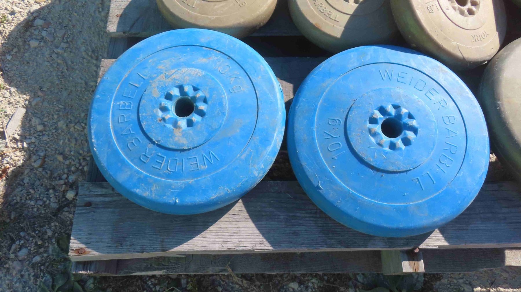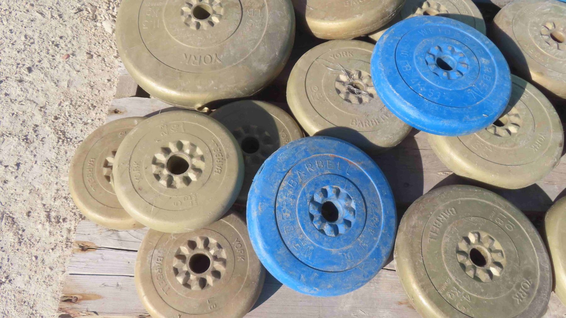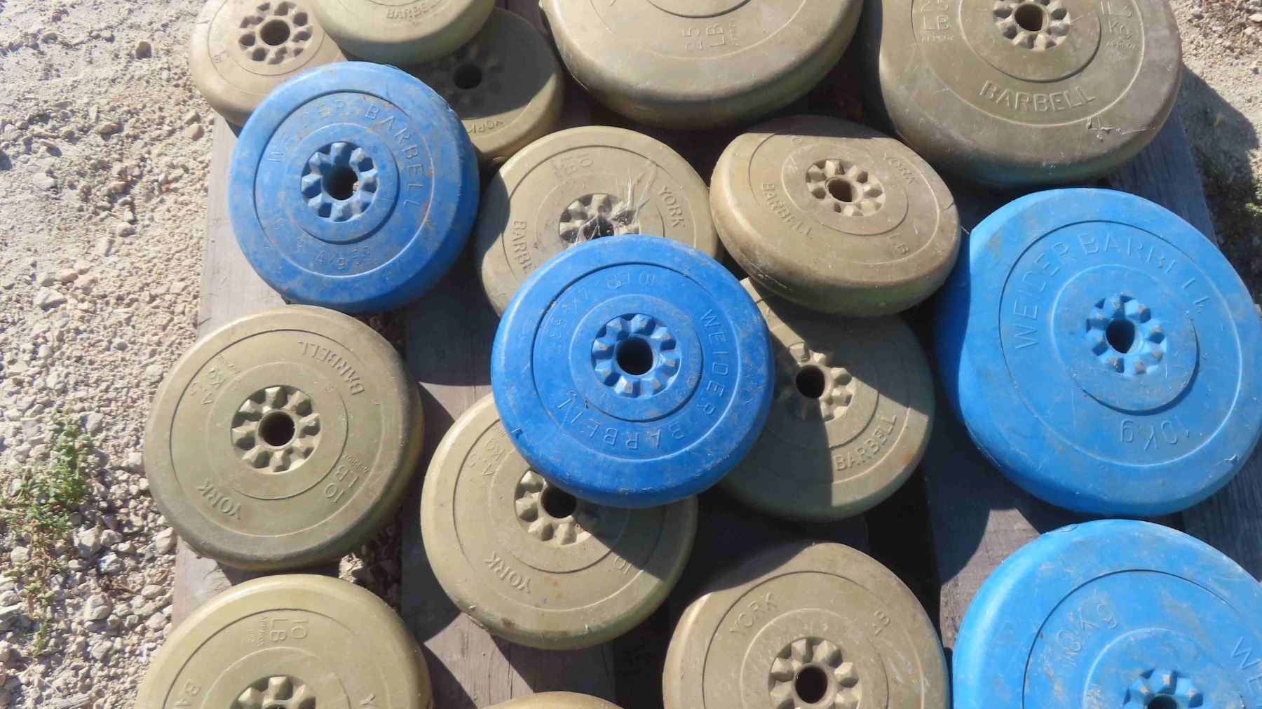 Pallet Lot: 18 Blue and Gold Weights 5-25lbs