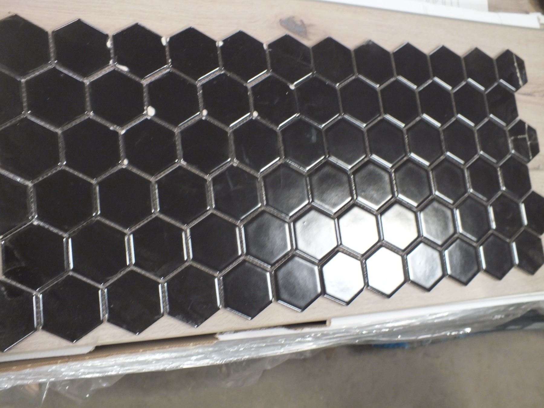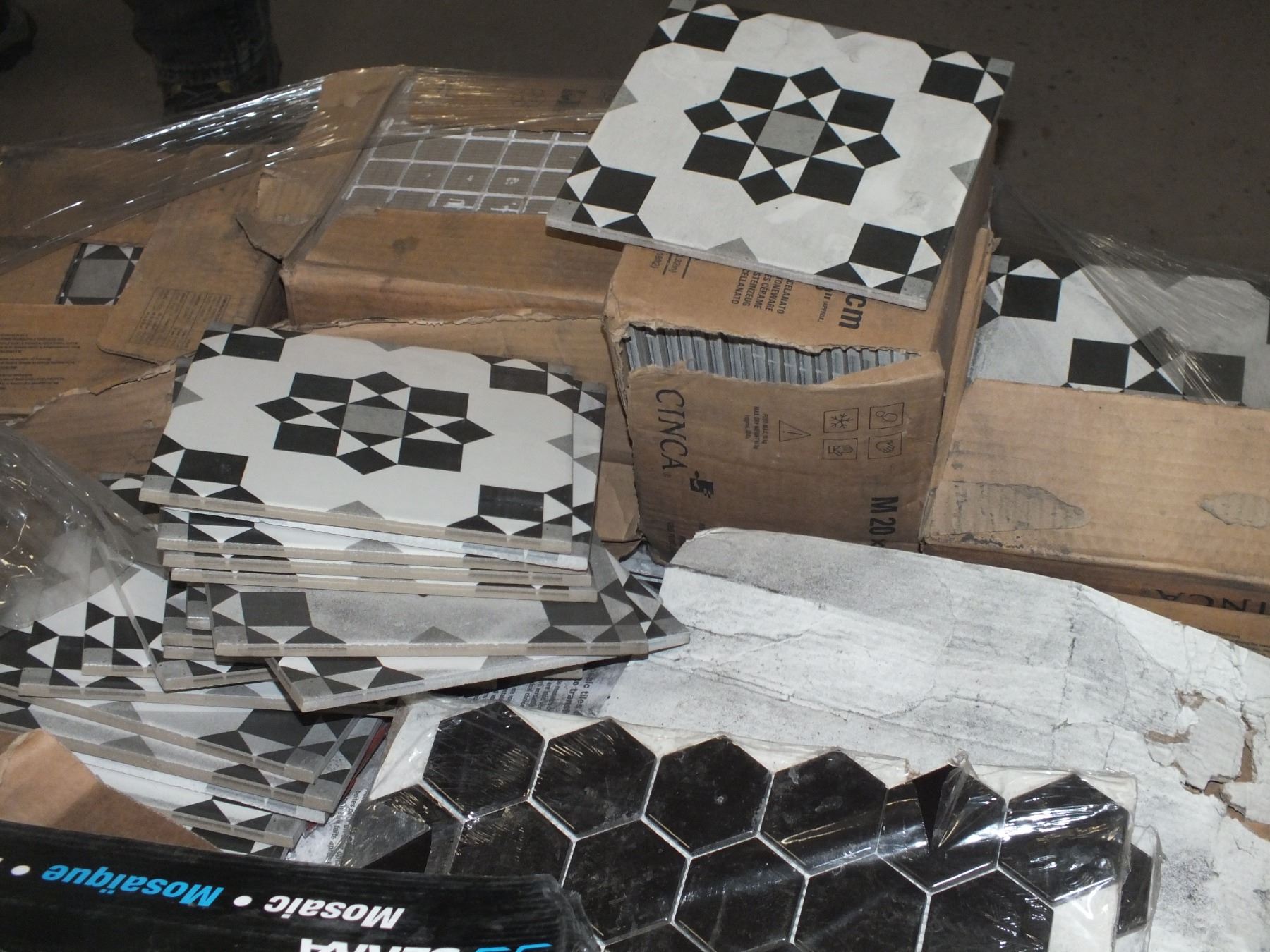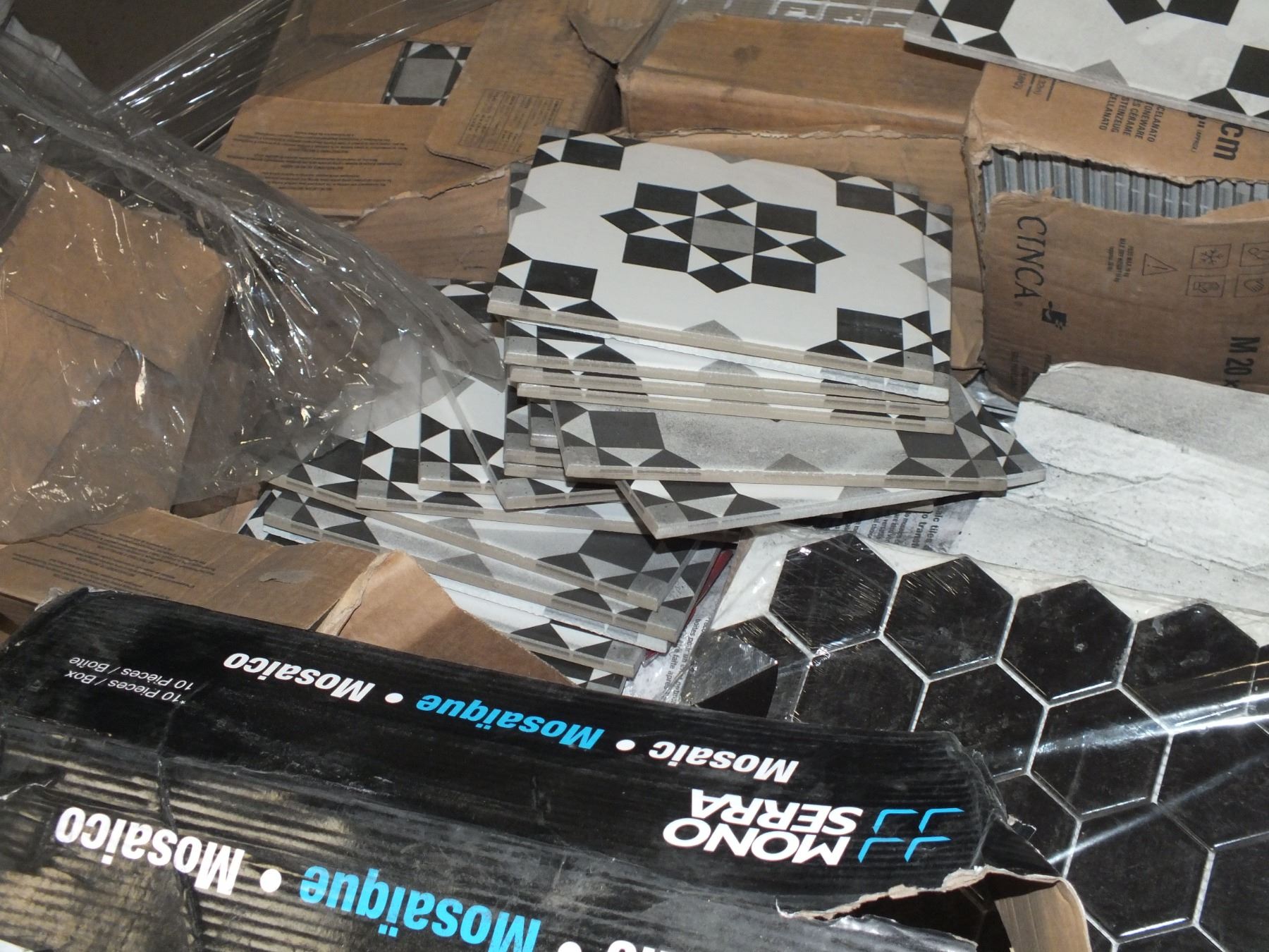 approx 30 boxes, 100sq ft of black, 250 sqft of black and white tile, some are damaged...freight claim...new