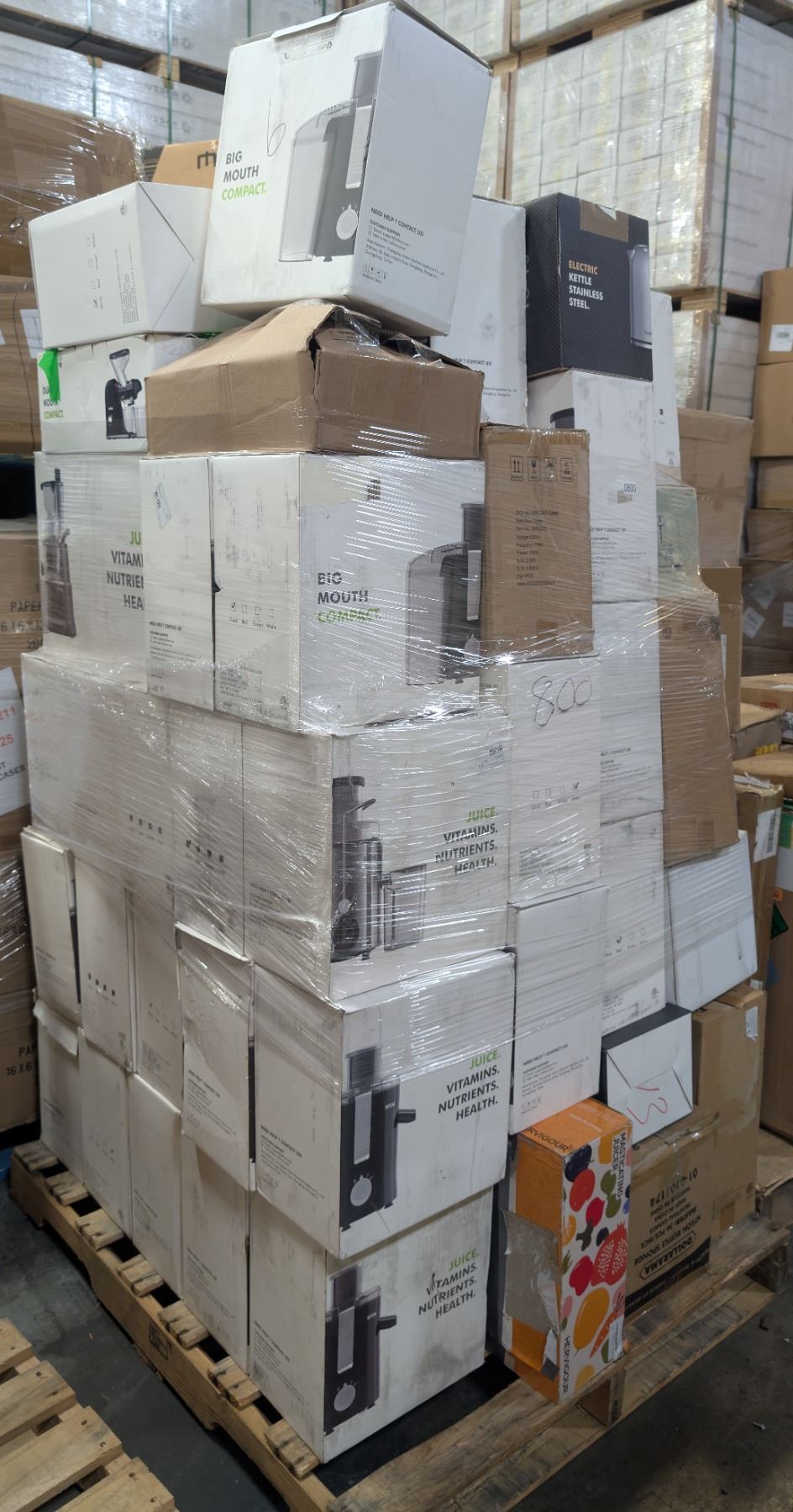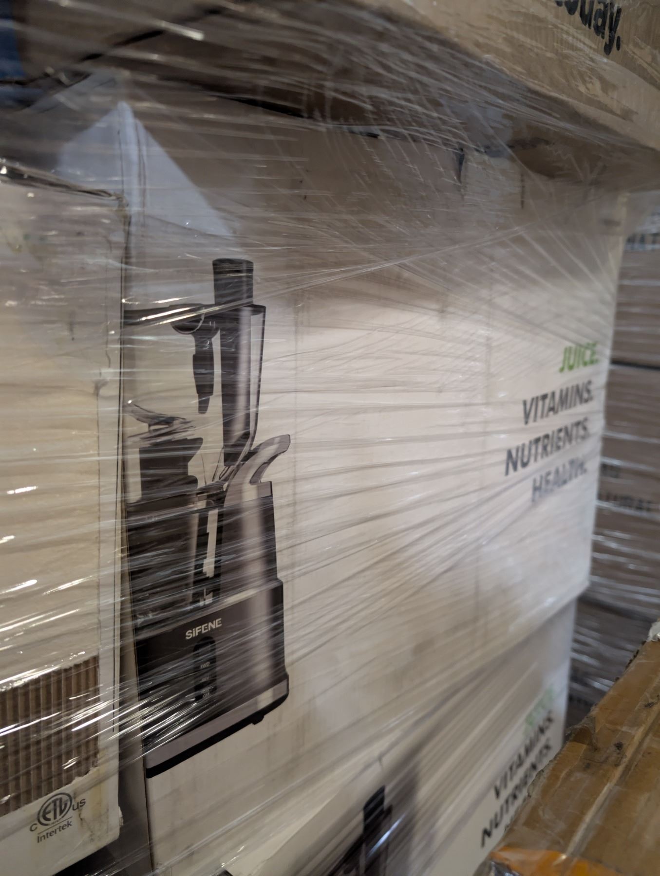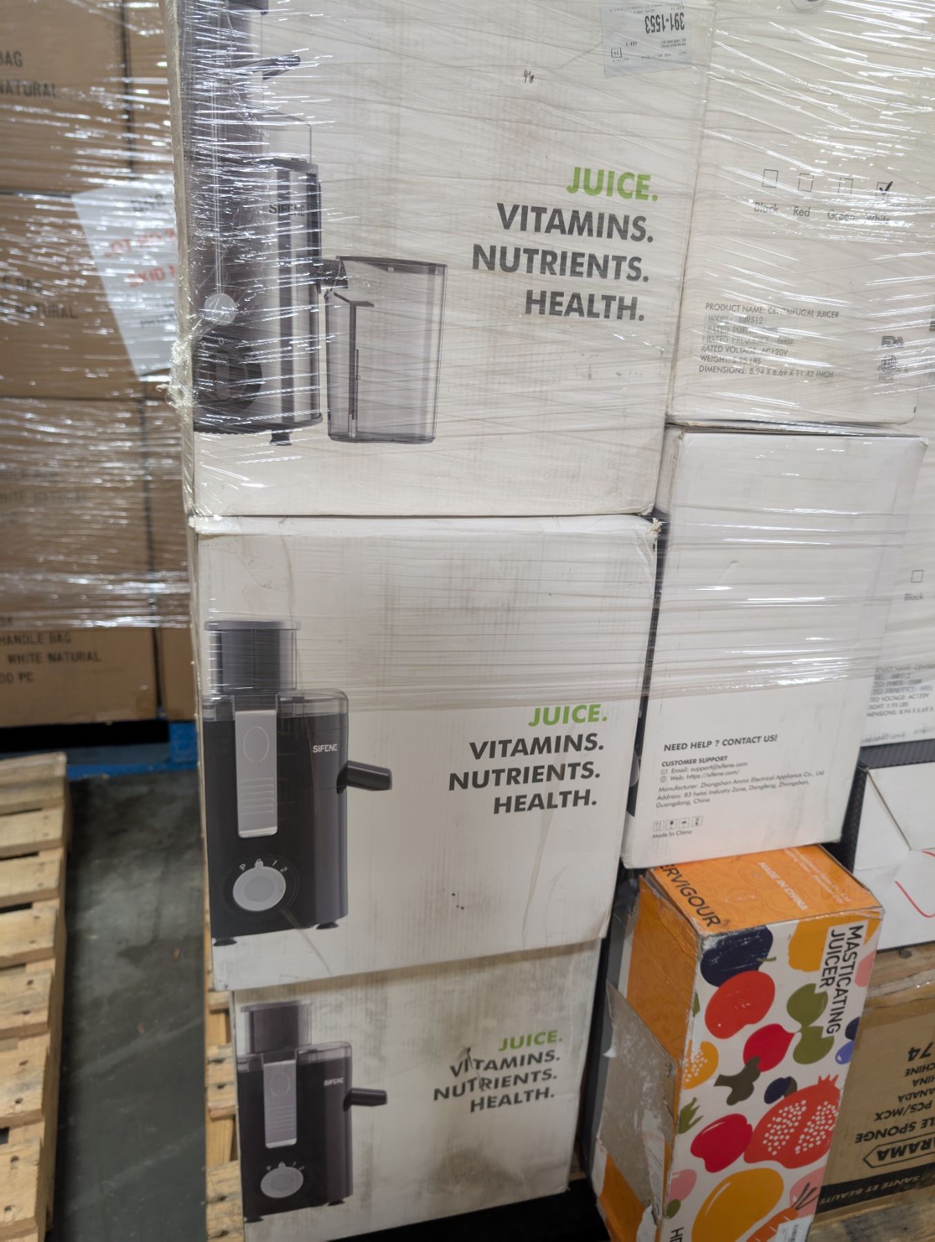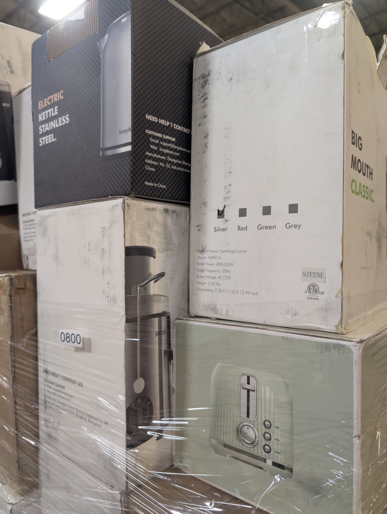 Pallet full of solid kitchen appliances - mostly juicers, toaster.