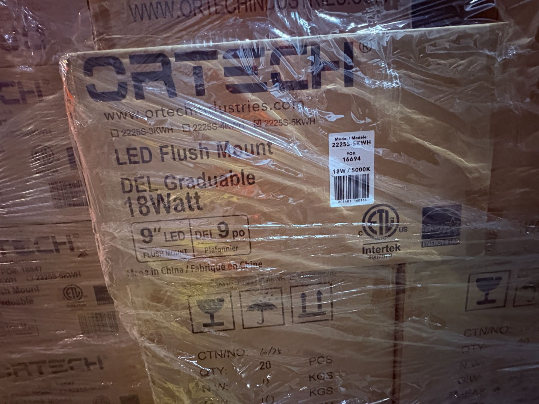 Pallet of Ortech lighting - 23 Boxes of 2225S-5KWH LED Flush Mount - $20.96/pc - 460 pce Retail - $9,641.6/ 26 Boxes of 1051-5KWH LED Ceiling Light - $22.67/pc - 529 pce Retail $11,992.43/ TOTAL LOT RETAIL $21,634.03. PICKUP FOR THIS LOT IS AT POCKIT SELF STORAGE ABBOTSFORD, 2992 PINEGROVE ST, ABBOTSFORD, BC V4X 1T3. PICKUP VIA APPOINTMENT ONLY, LOT WINNER WILL BE CONTACTED TO BOOK AN APPOINTMENT.