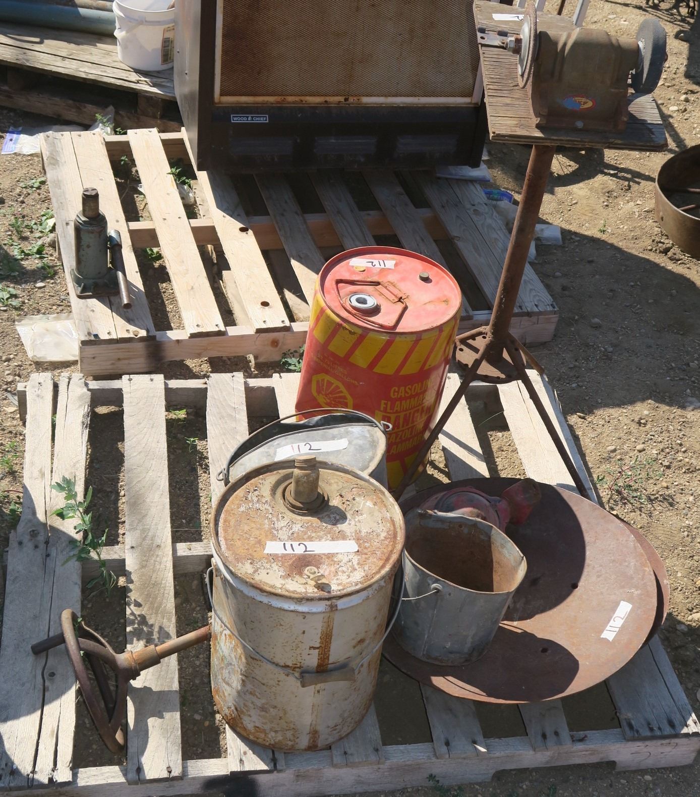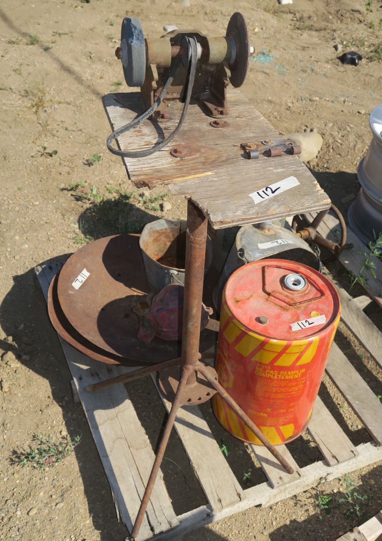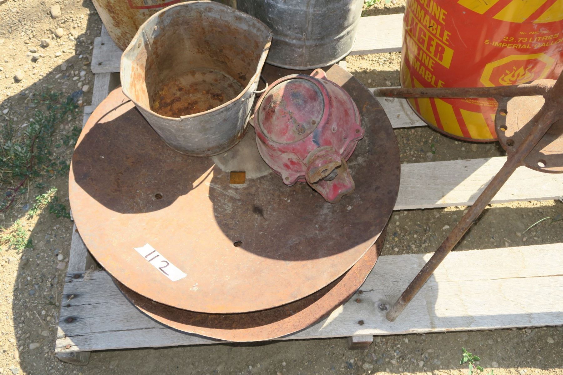 Pallet of Vintage Metal Discs, Grinder on Stand, Oil Cans, etc.
