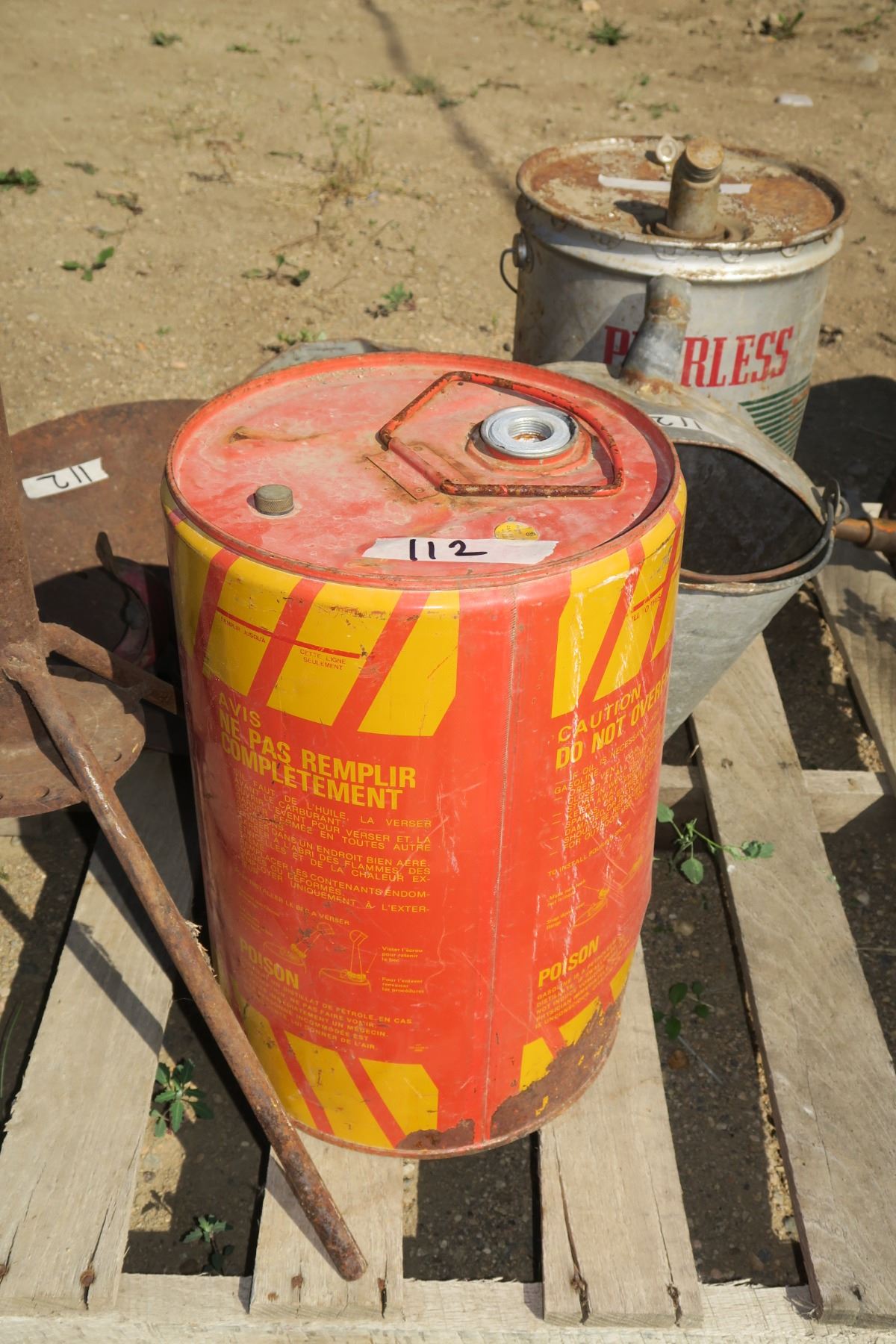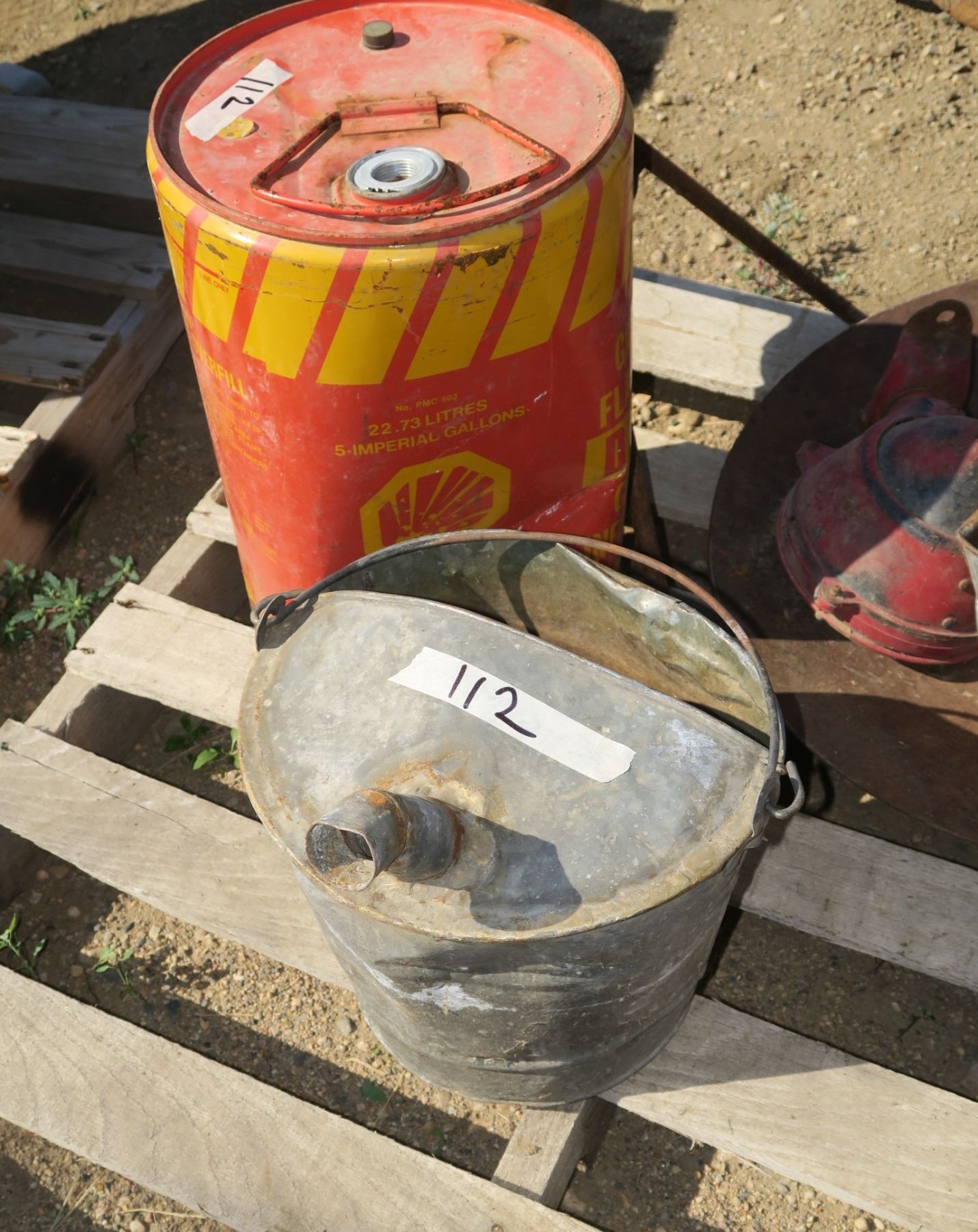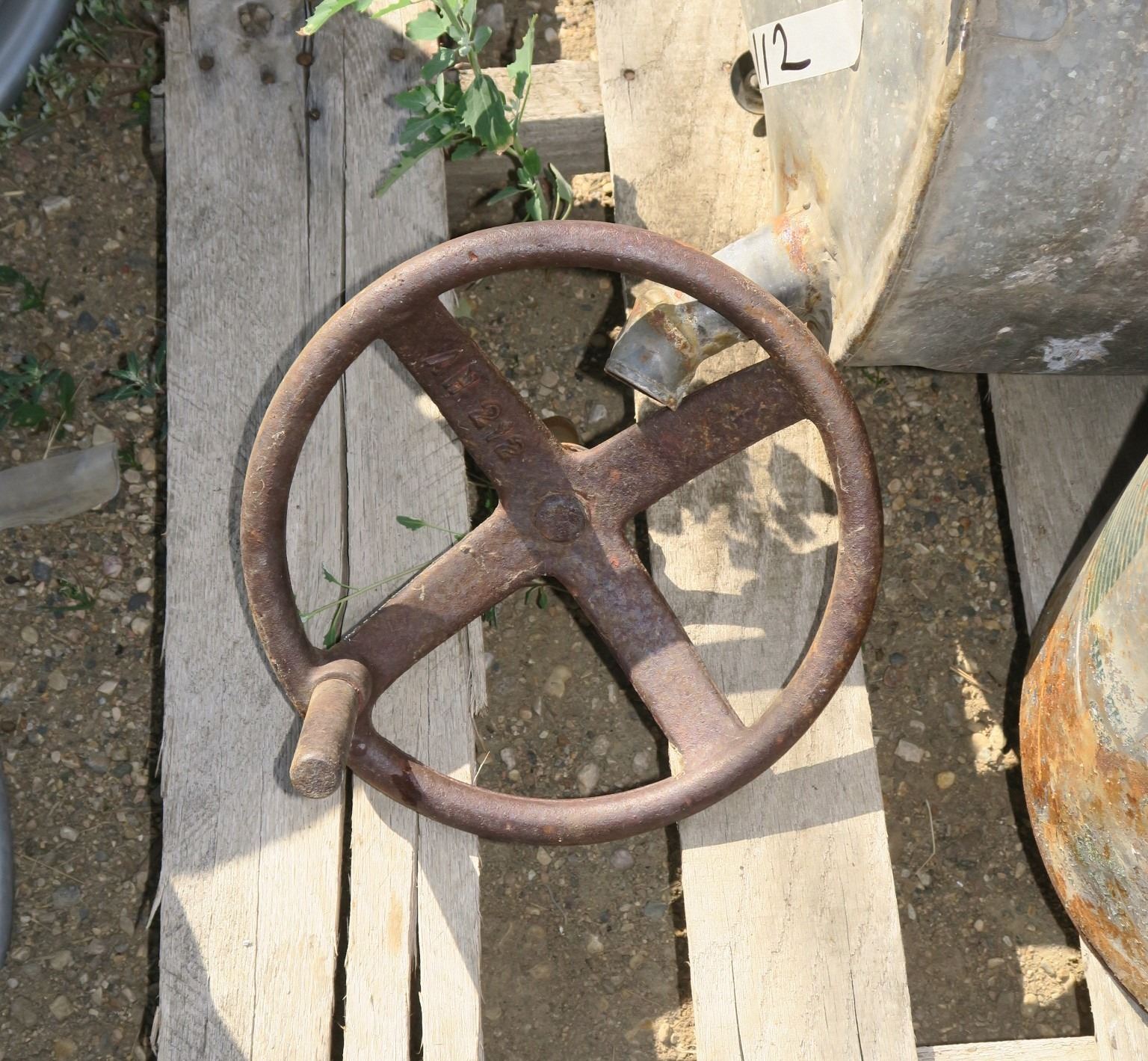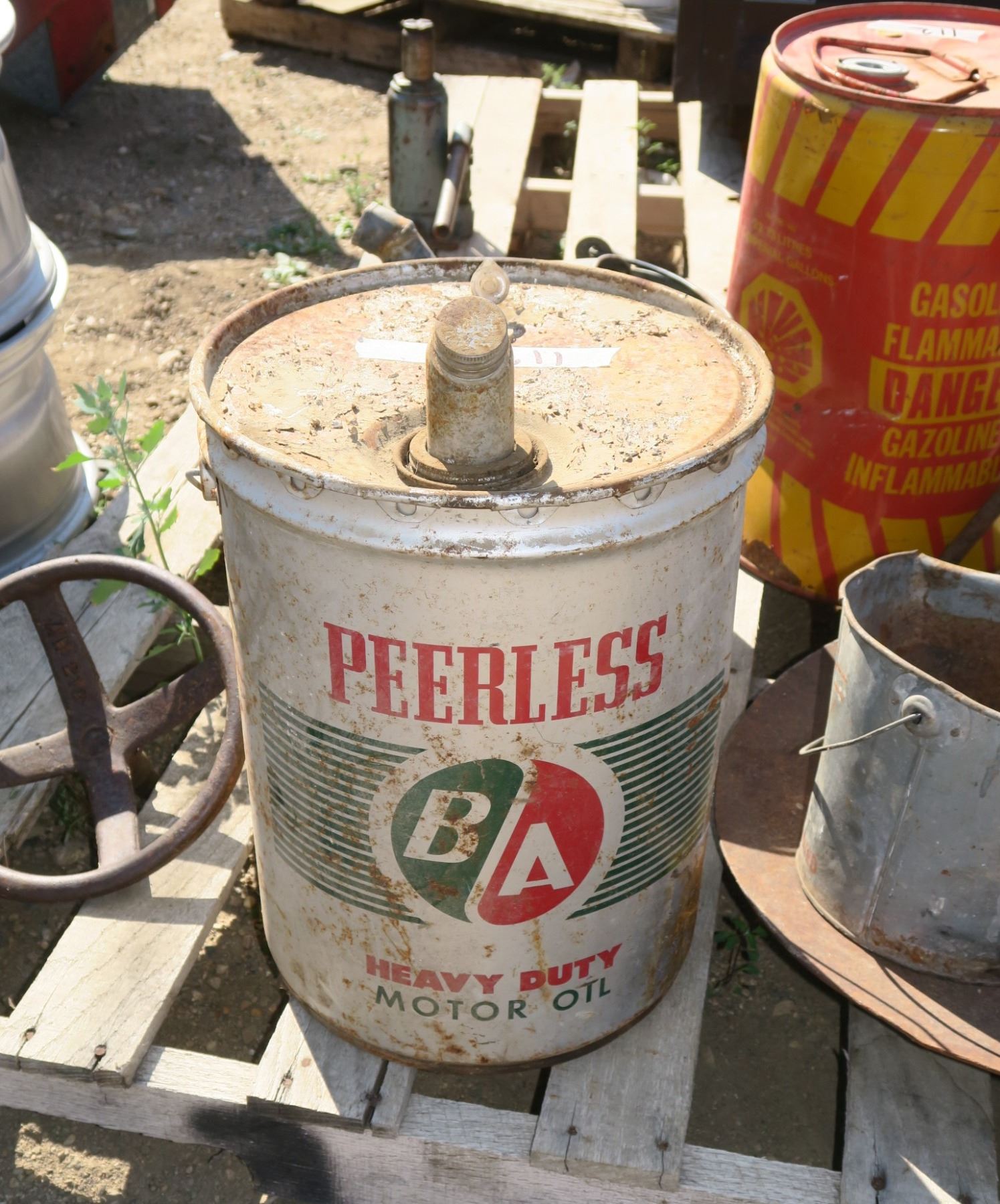 Pallet of Vintage Metal Discs, Grinder on Stand, Oil Cans, etc.