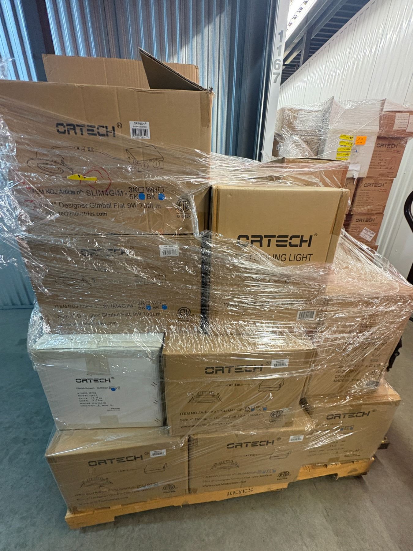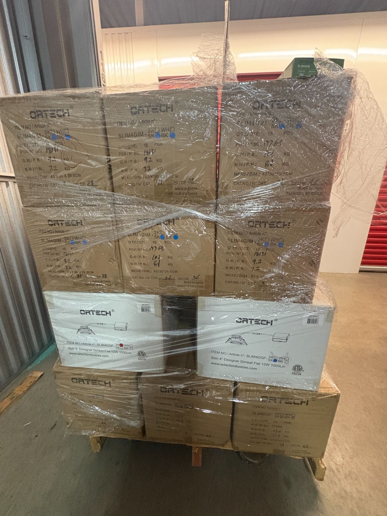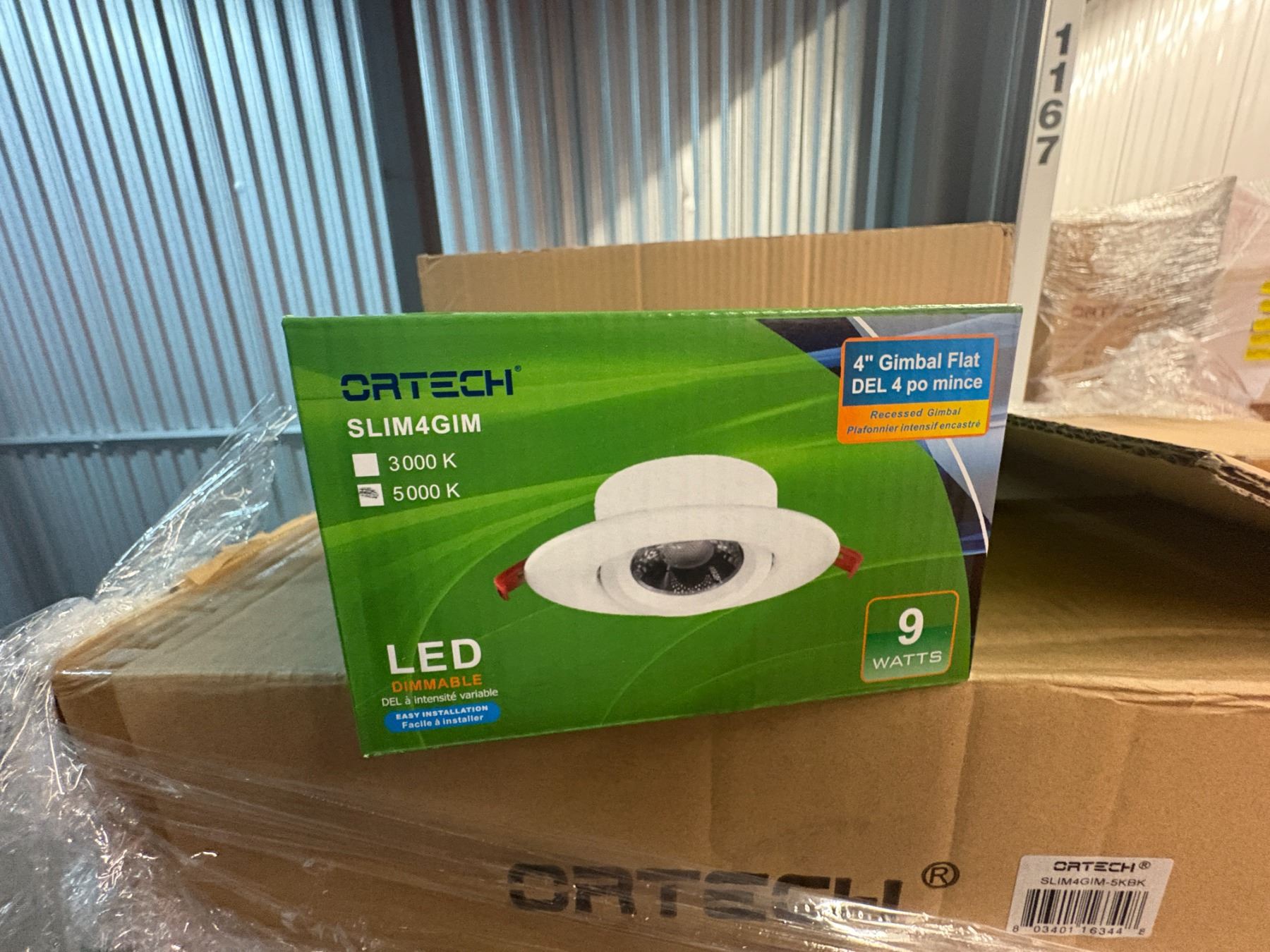 Pallet of assorted Ortech light fixtures - 5000K Ortech SLIM4GIM 8W 4" LED Economical Gimbal Downlight, SLIM4DGF 4" Designer Gimbal Flat 12W 3K, 5K etc.. PICKUP FOR THIS LOT IS AT POCKIT SELF STORAGE ABBOTSFORD, 2992 PINEGROVE ST, ABBOTSFORD, BC V4X 1T3. PICKUP VIA APPOINTMENT ONLY, LOT WINNER WILL BE CONTACTED TO BOOK AN APPOINTMENT.