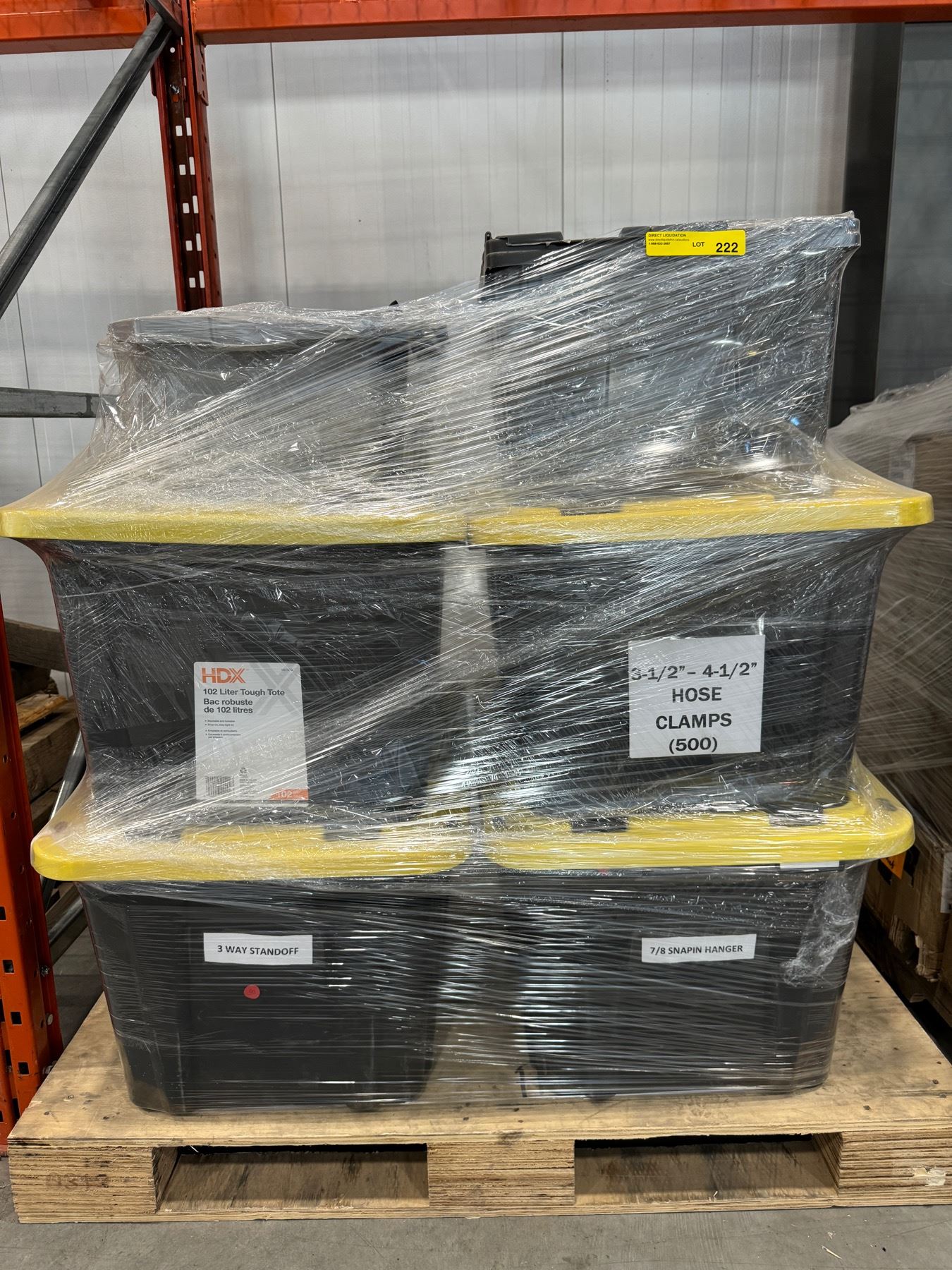 Pallet of assorted attachments - includes hose clamps, 7/8 snap in hanger, 3 way standoff, SST clip hanger & etc