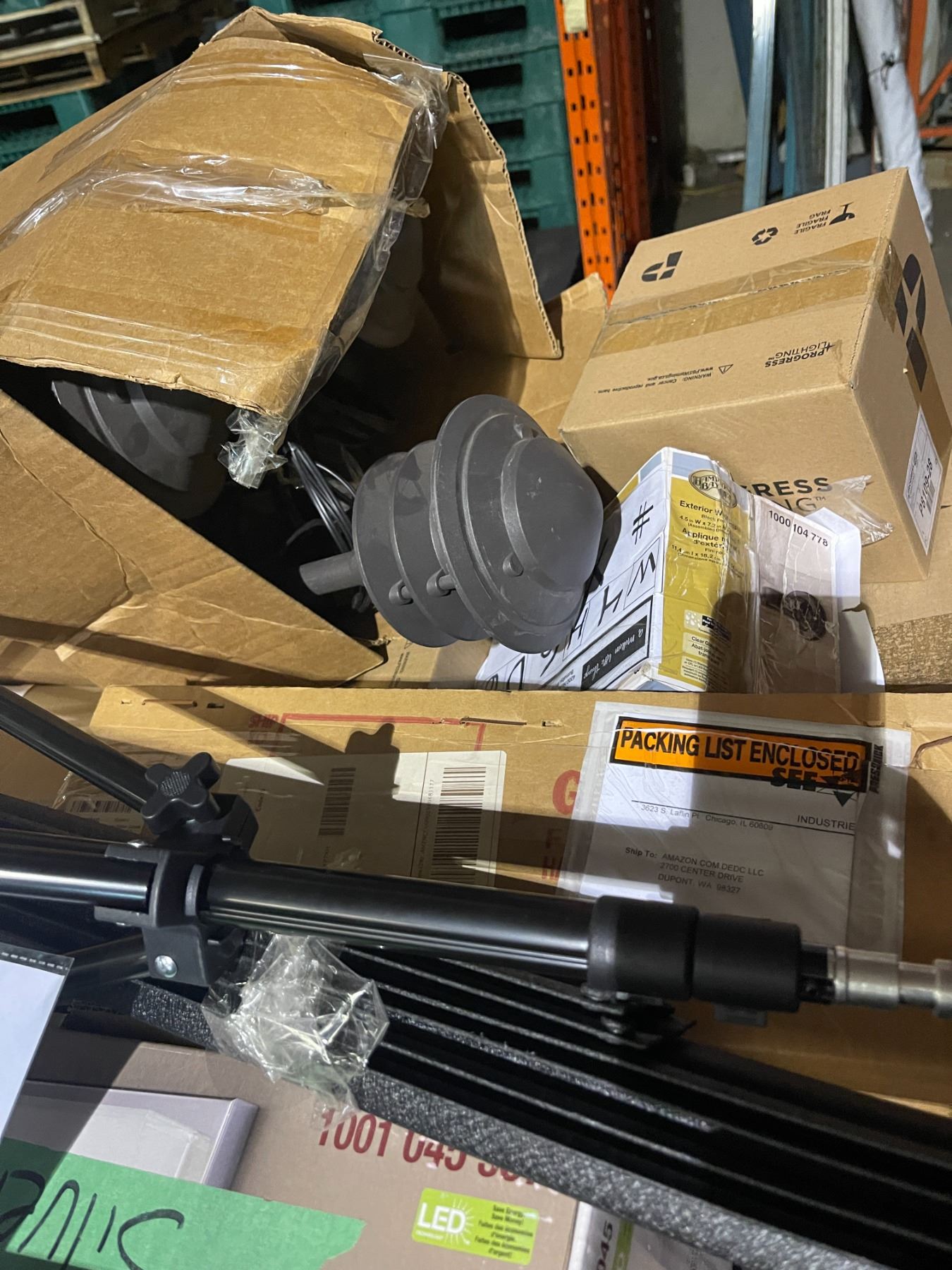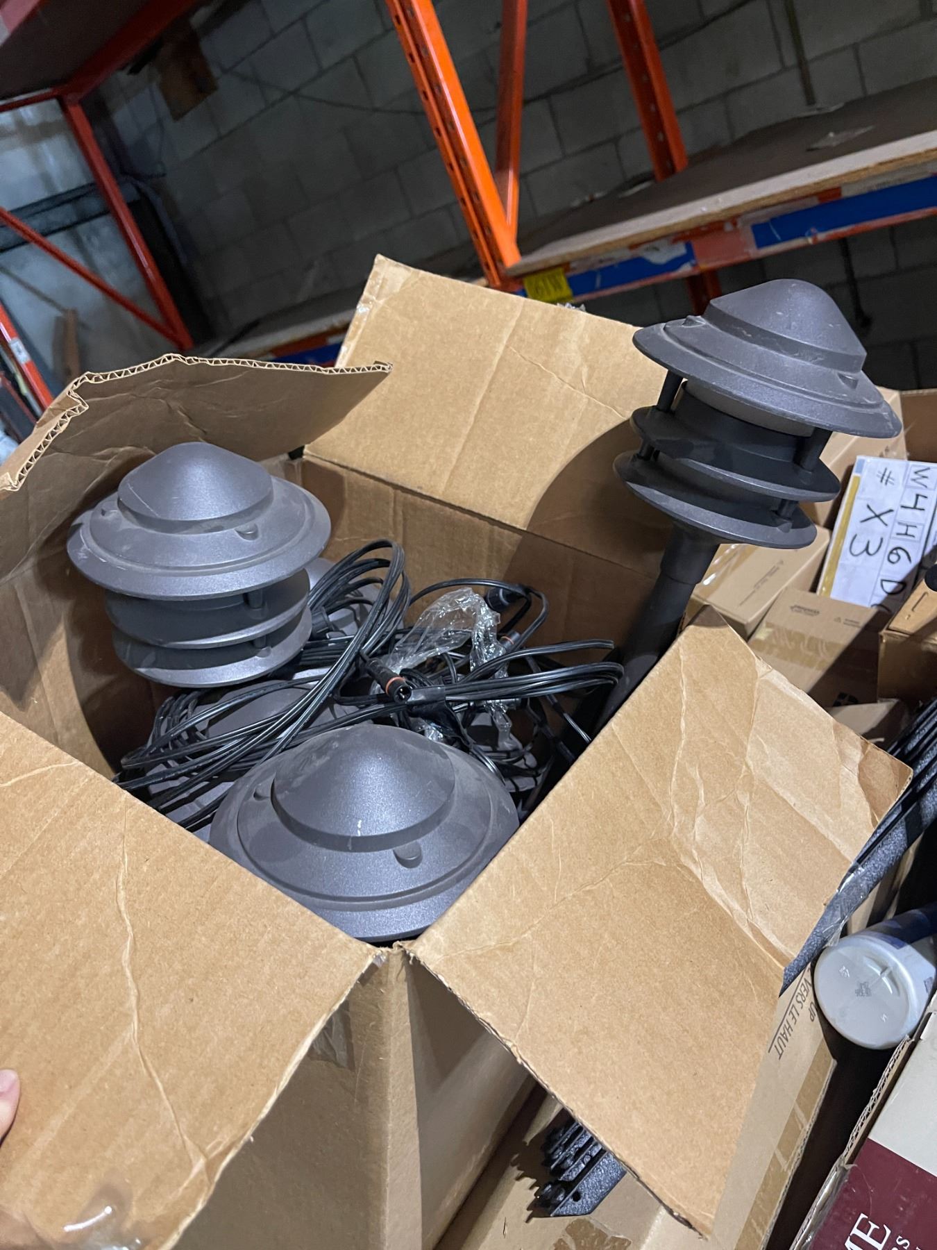 Pallet of assorted misc items - includes LED vanity fixtures / Moisture recovery shampoo bottles / garden lawn lights / Amazon etc