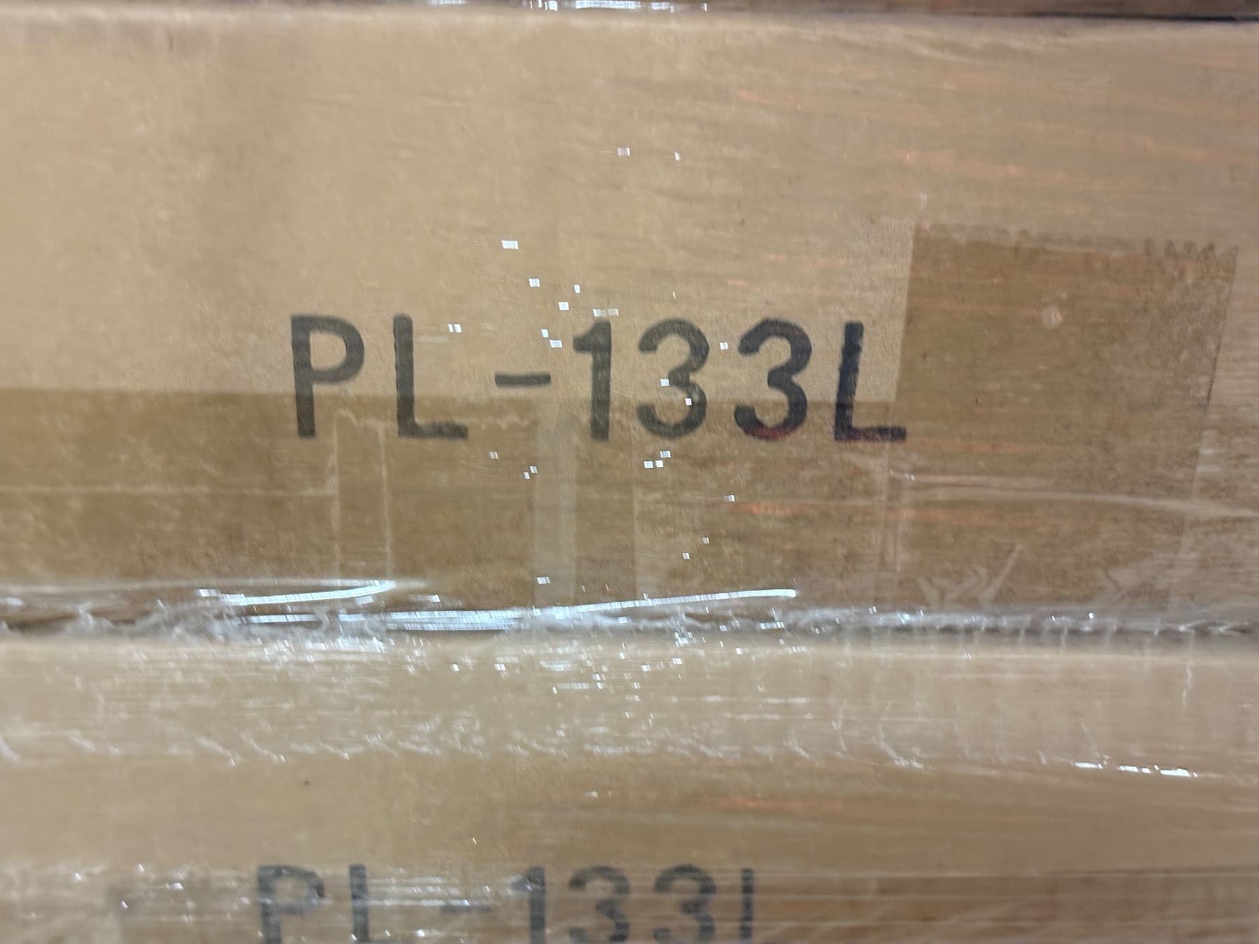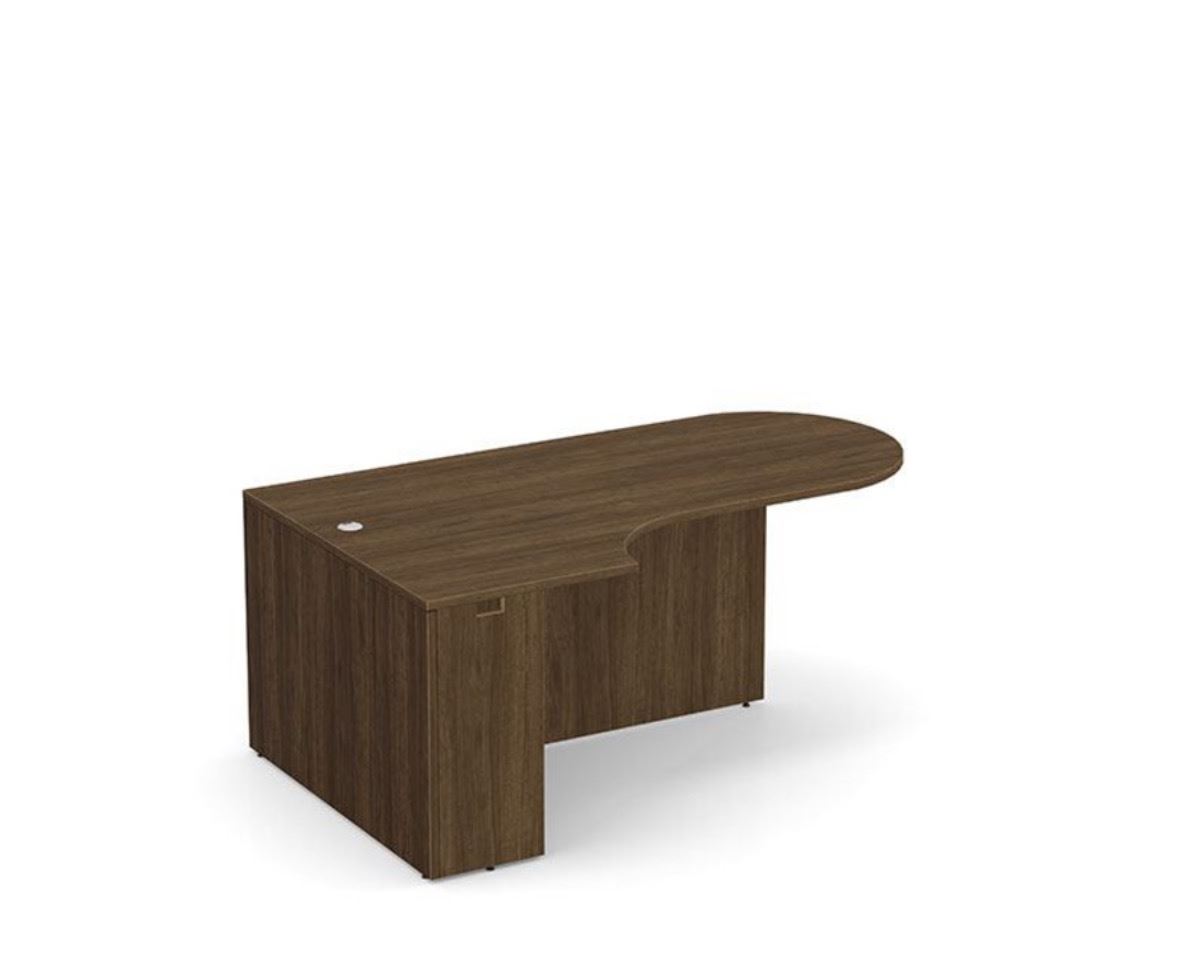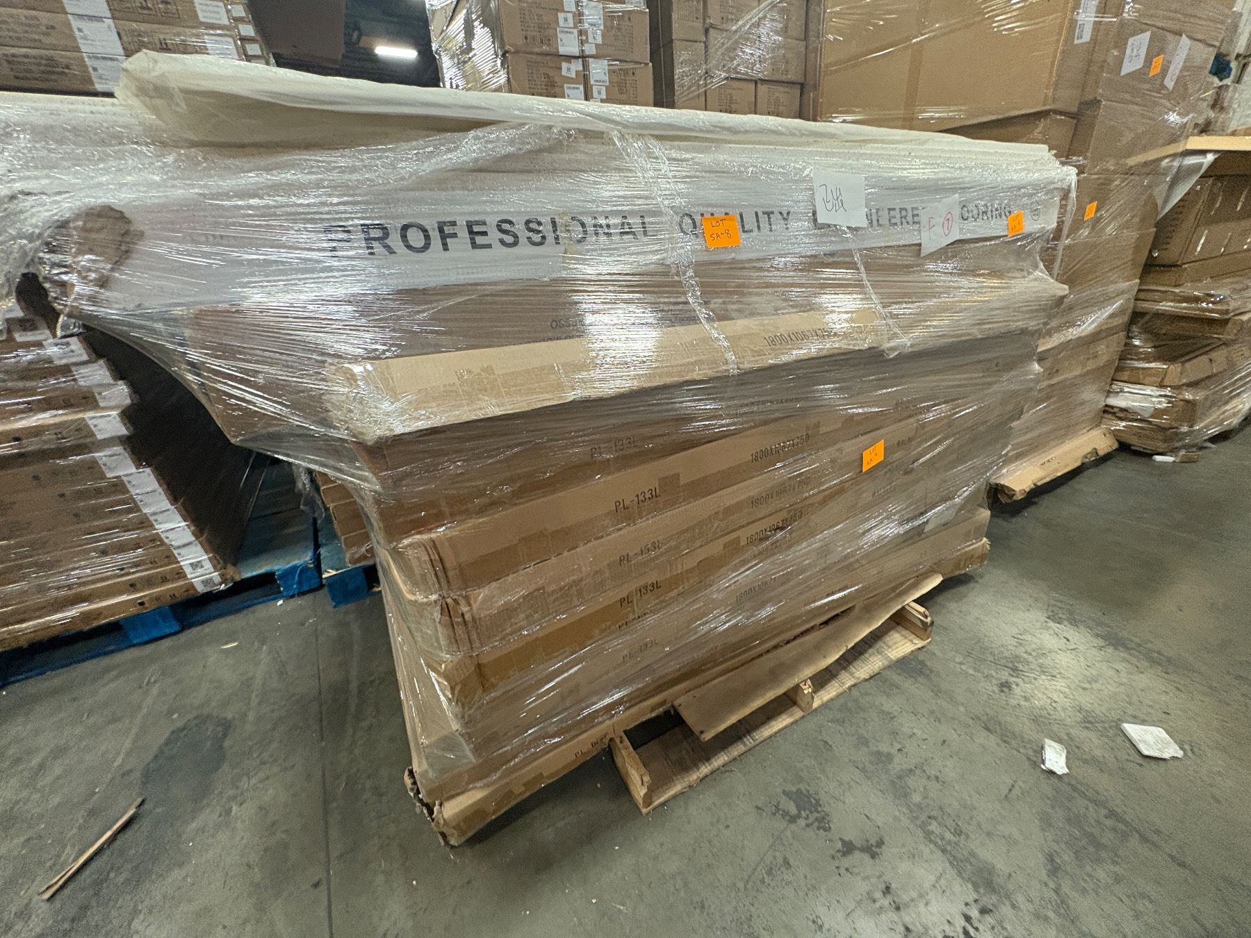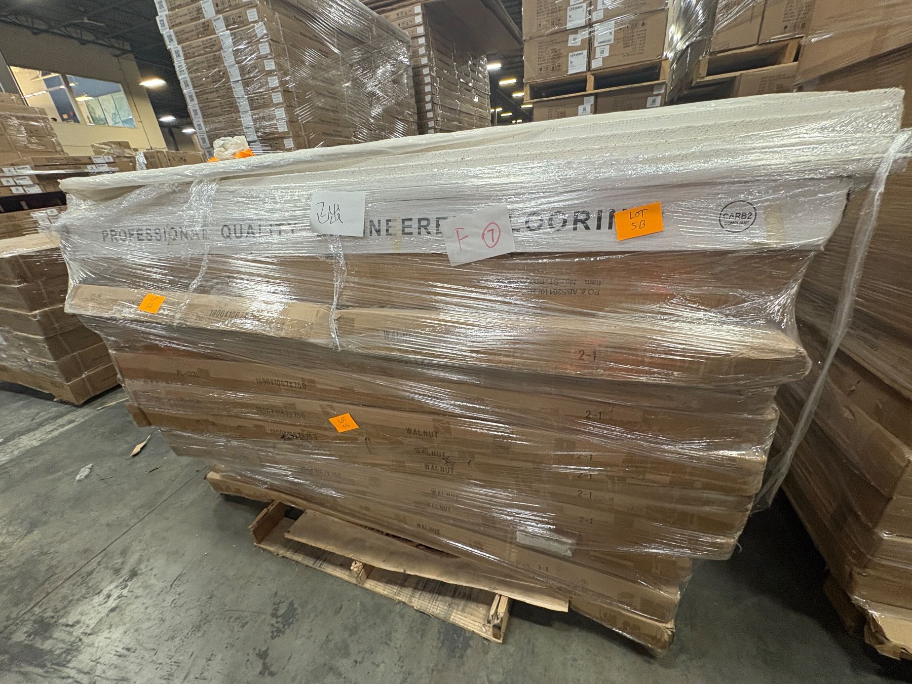Pallet of brand new 71" BULLET WITH CORNER EXTENSION-LEFT MODERN WALNUT tables And misc flooring