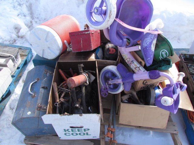 Pallet of misc. Items, sockets, tool boxes, tools and kids tricycle