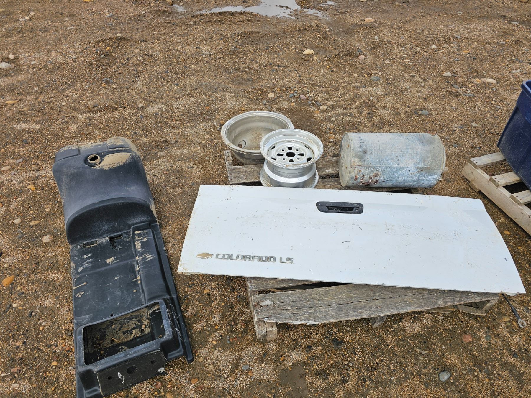 fuel tank, milk canister, old bottles, dually hubcaps, 4 bolt 12x7.5 rim, chevy colorado tailgate.