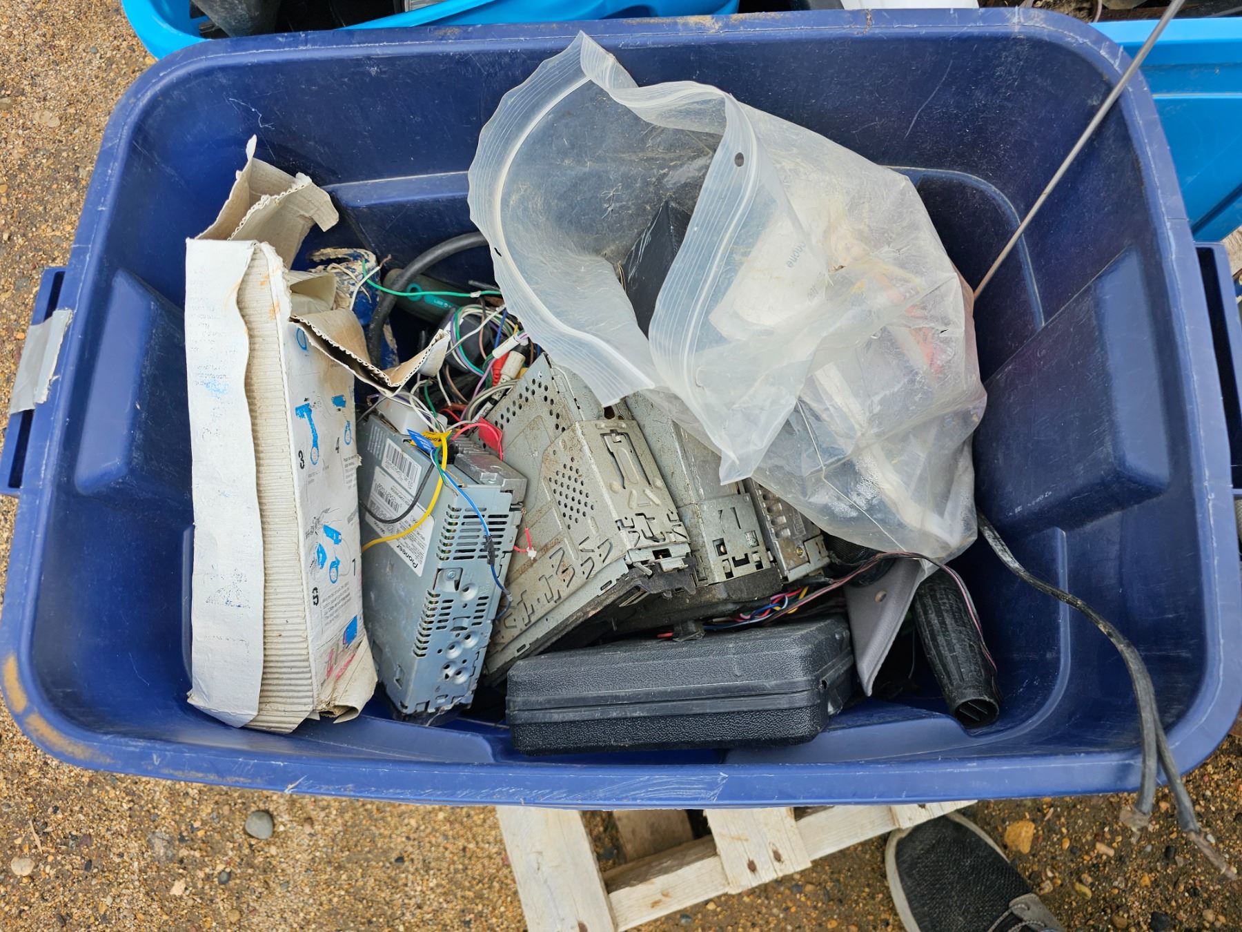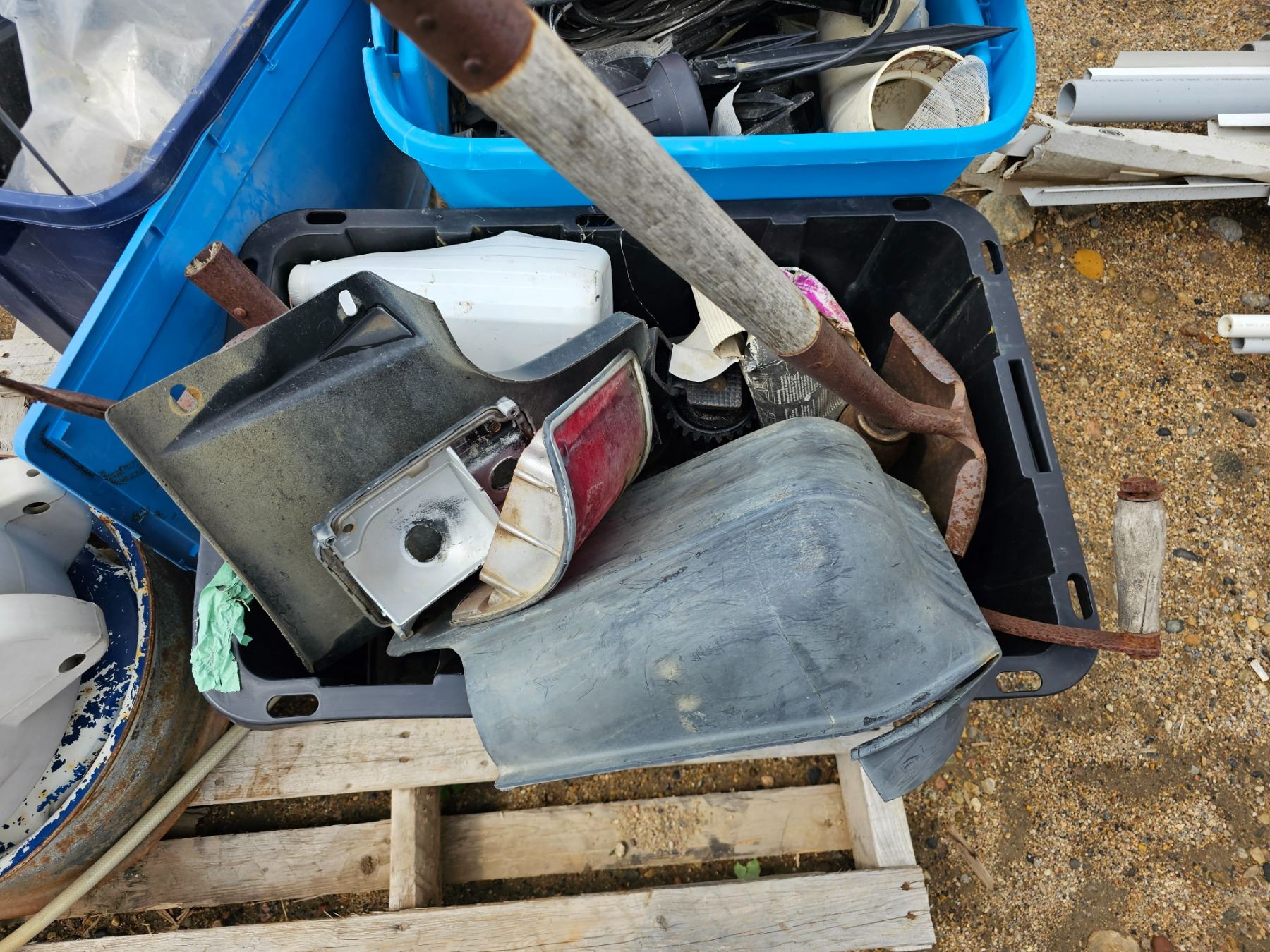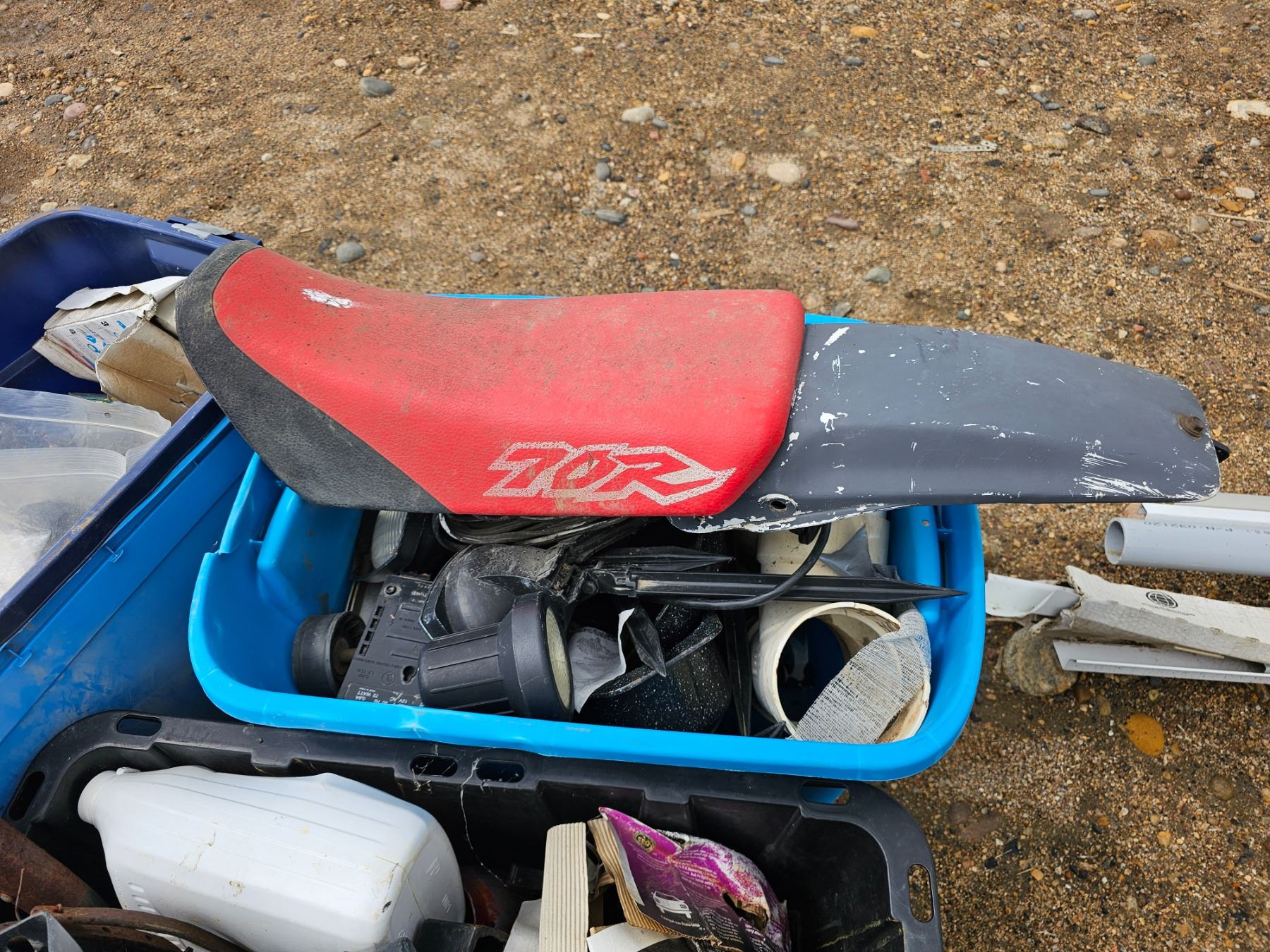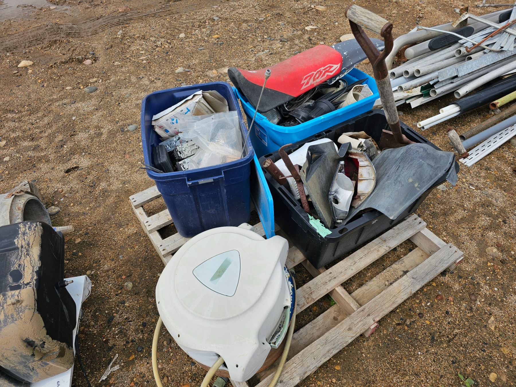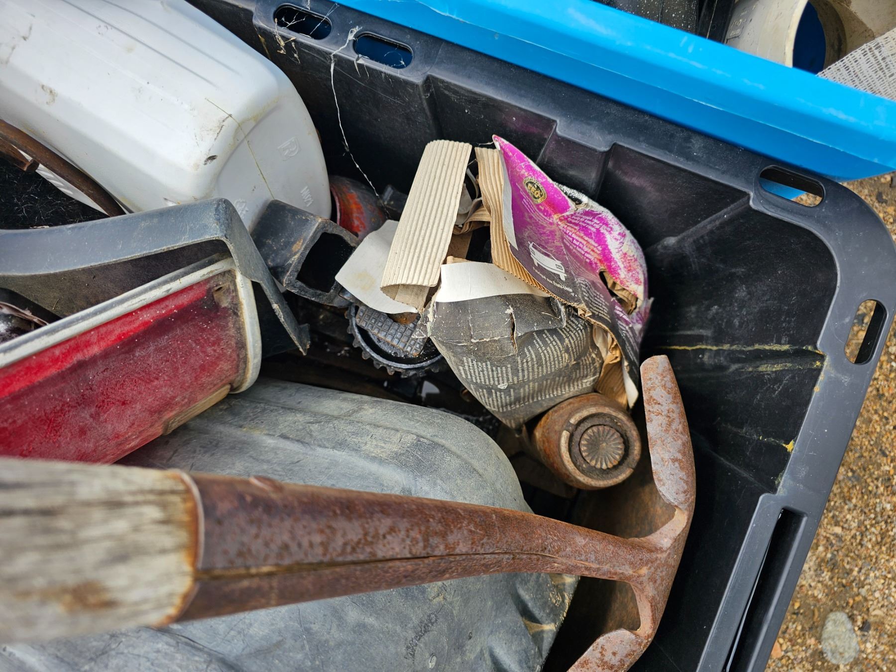 spare rim, bins of misc lights, piping, dirtbike seat (70r), car stereos, wiring, tools, bottle jack, shovel, garden hose reel w/ hose.