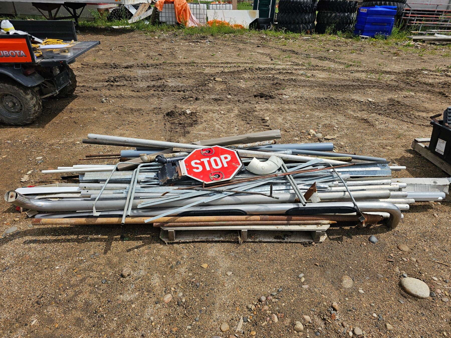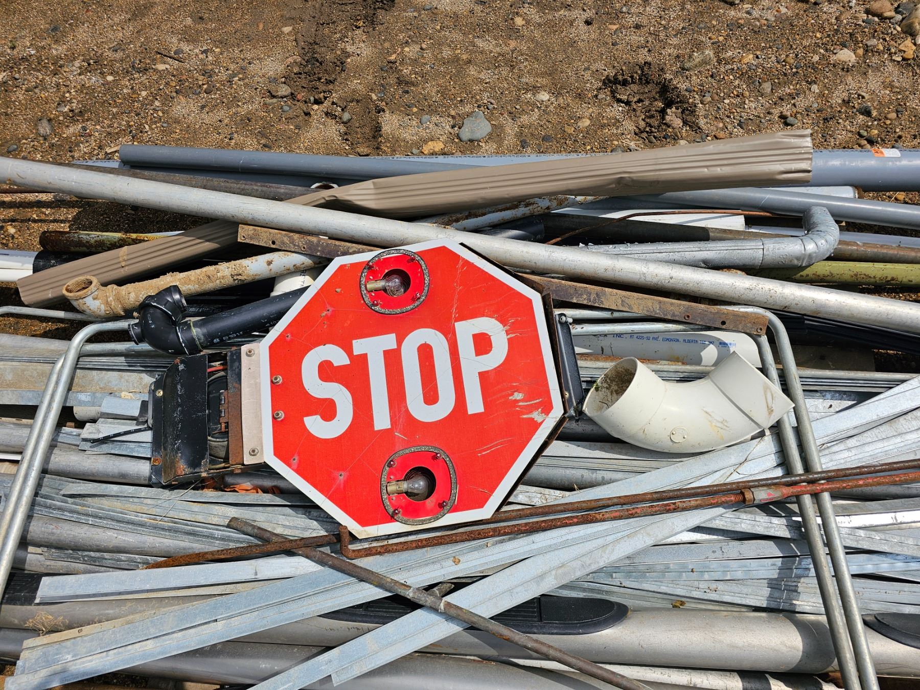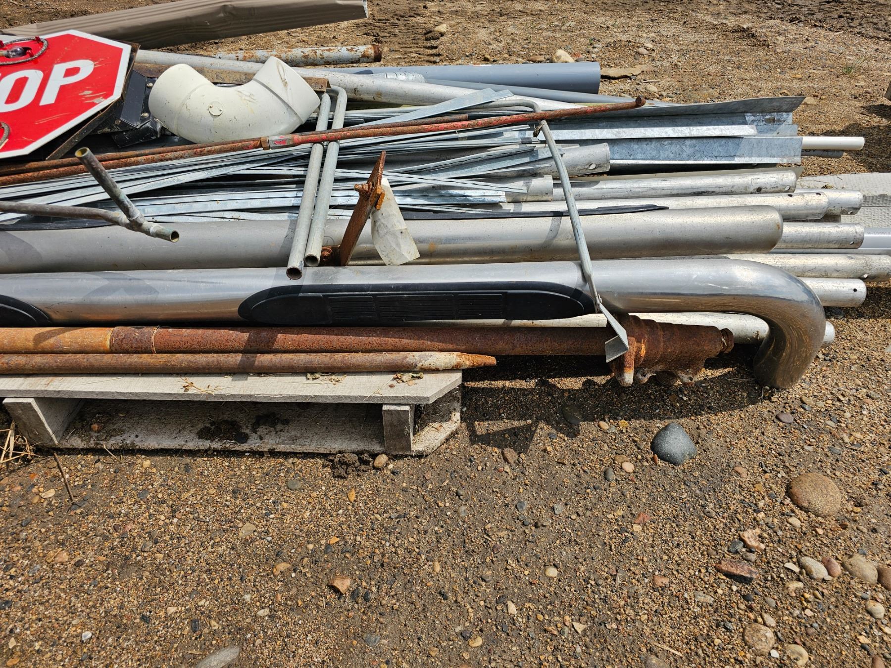 misc piping, truck side steps, school bus stop sign.