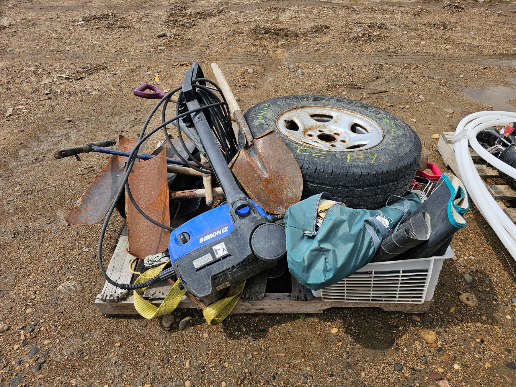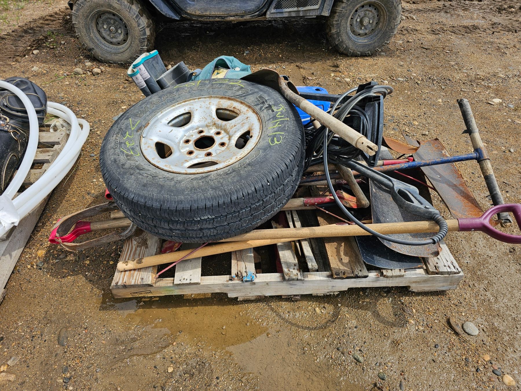 shovels, simoniz pressure washer, straps, P235/75R16 tire w/ rim, steel toe boots, tent/awning, post hole auger.