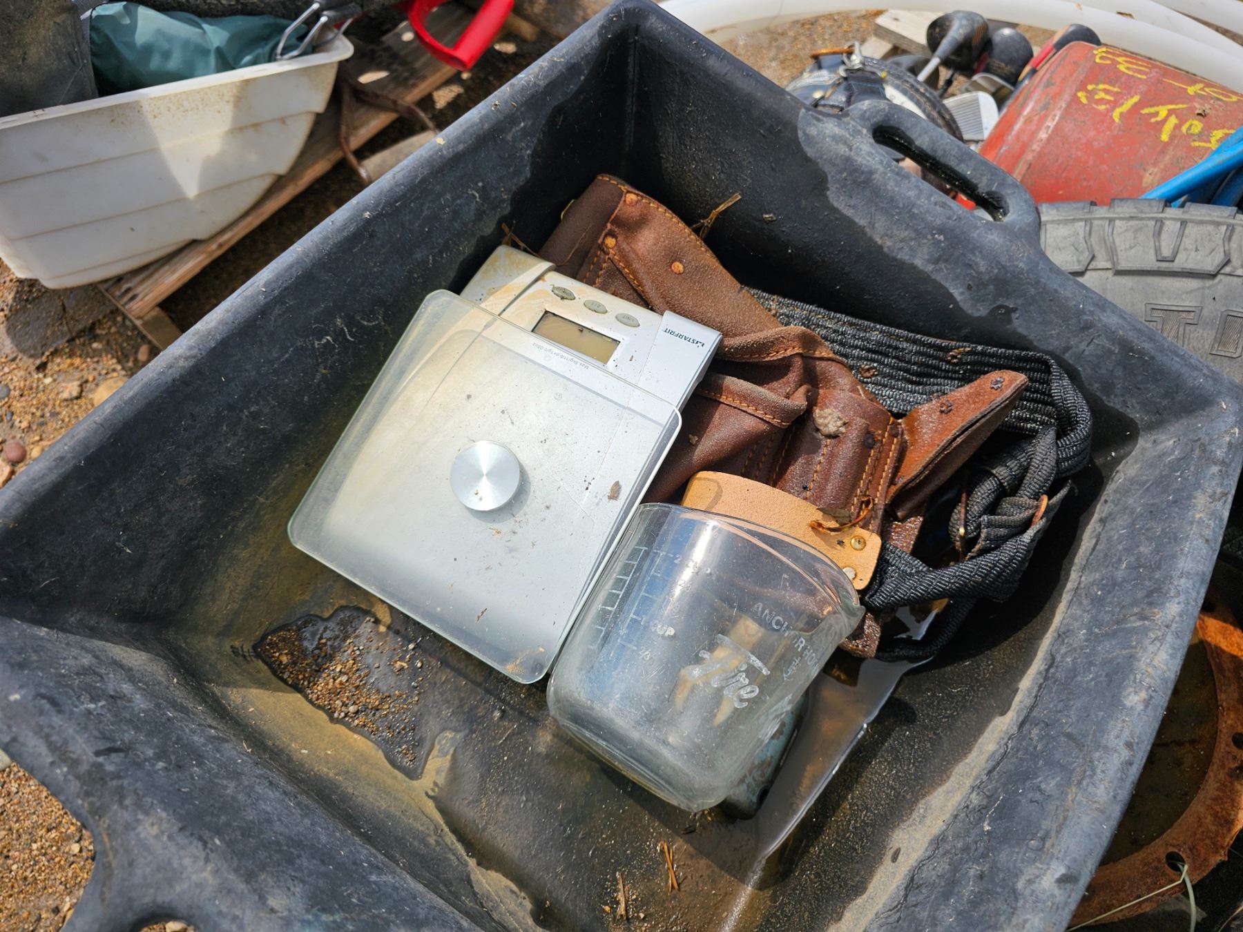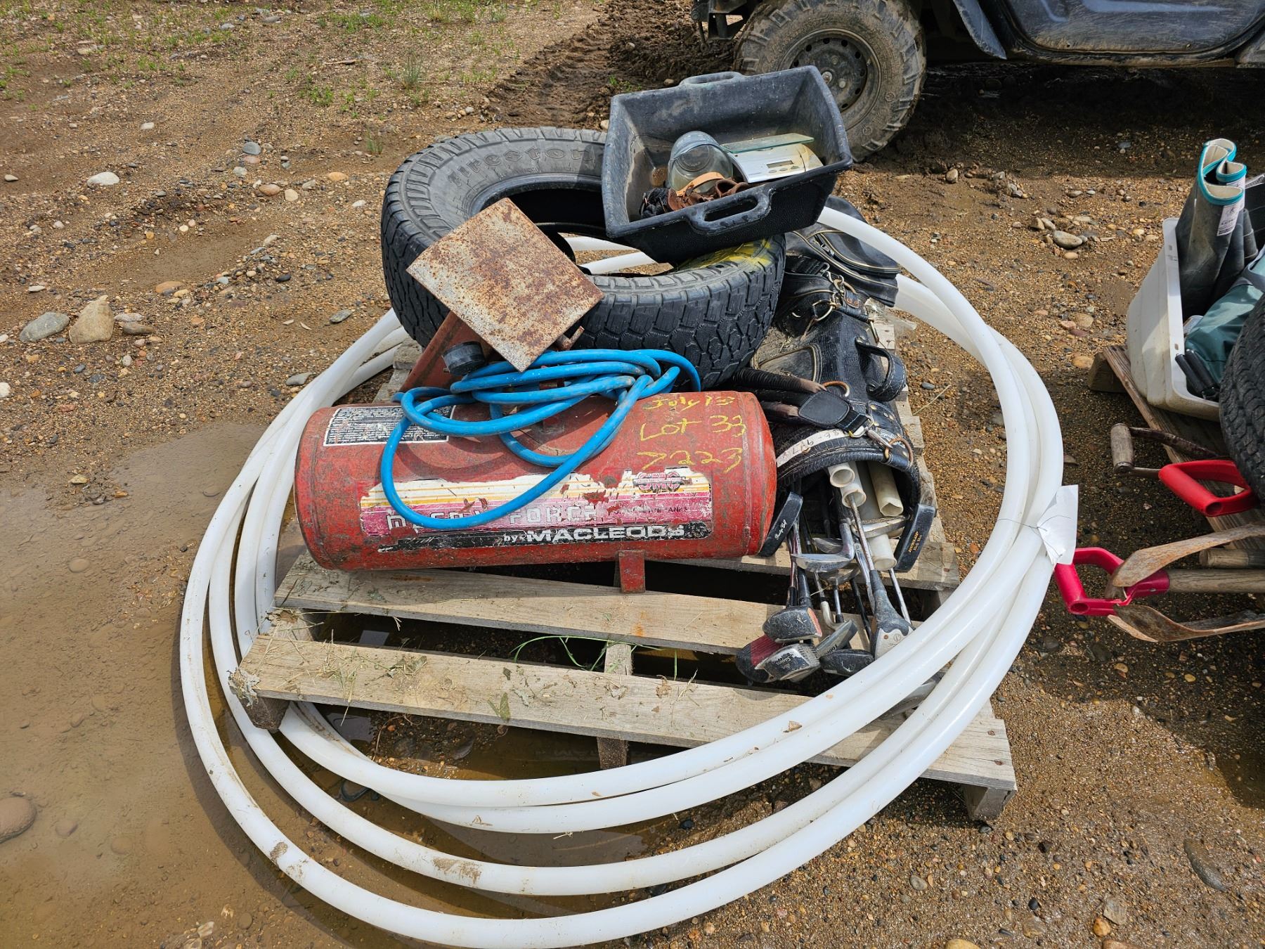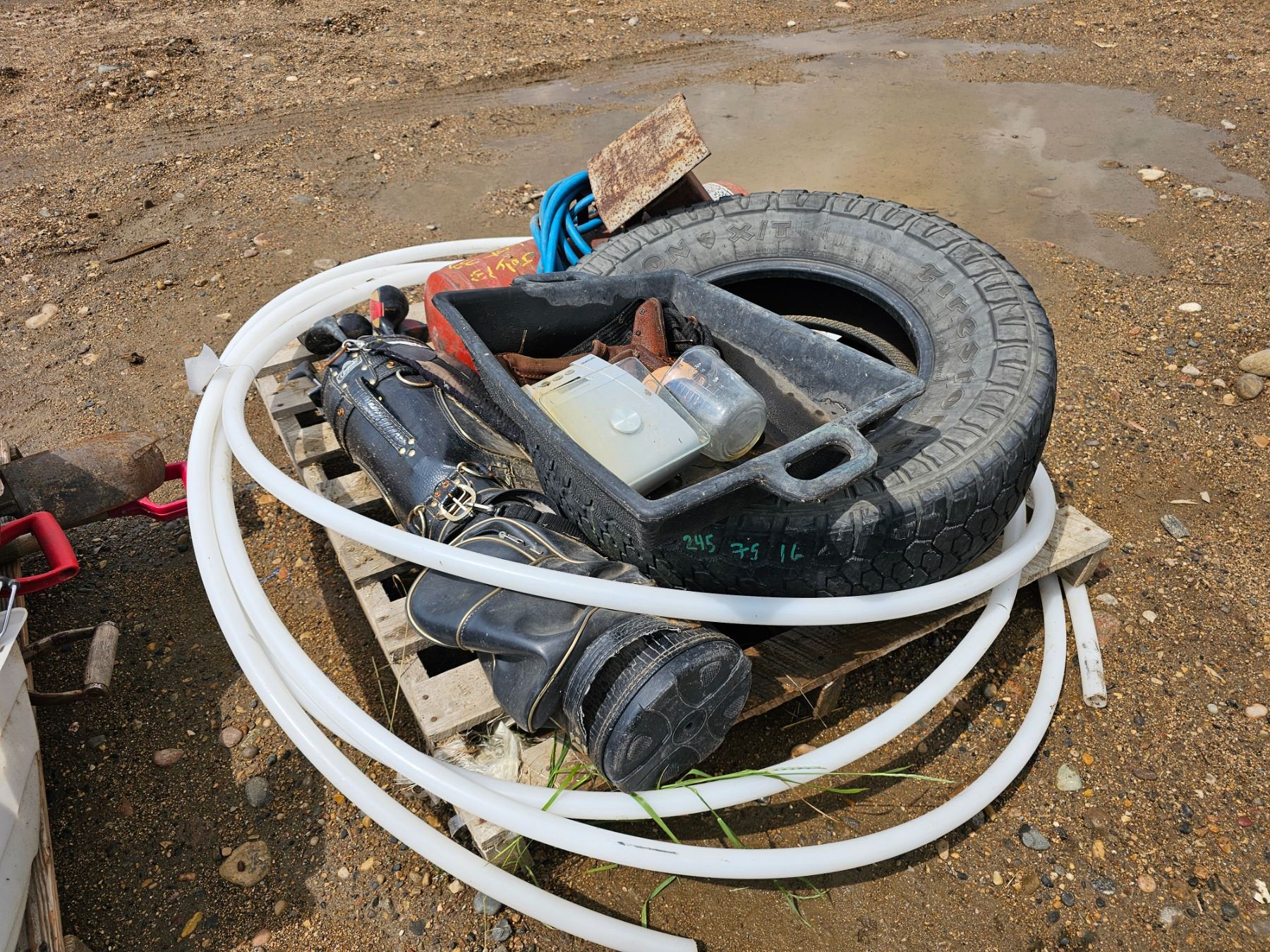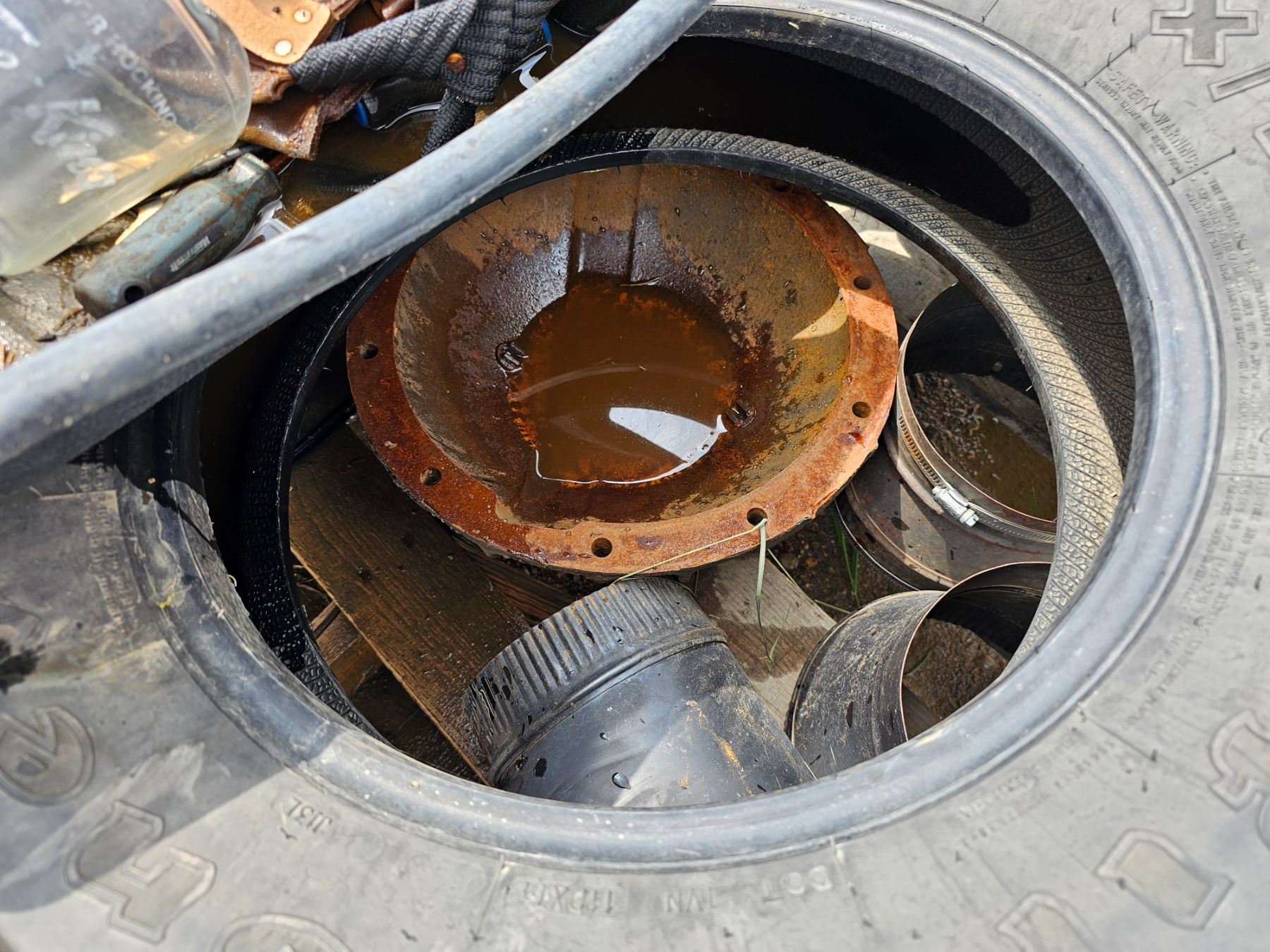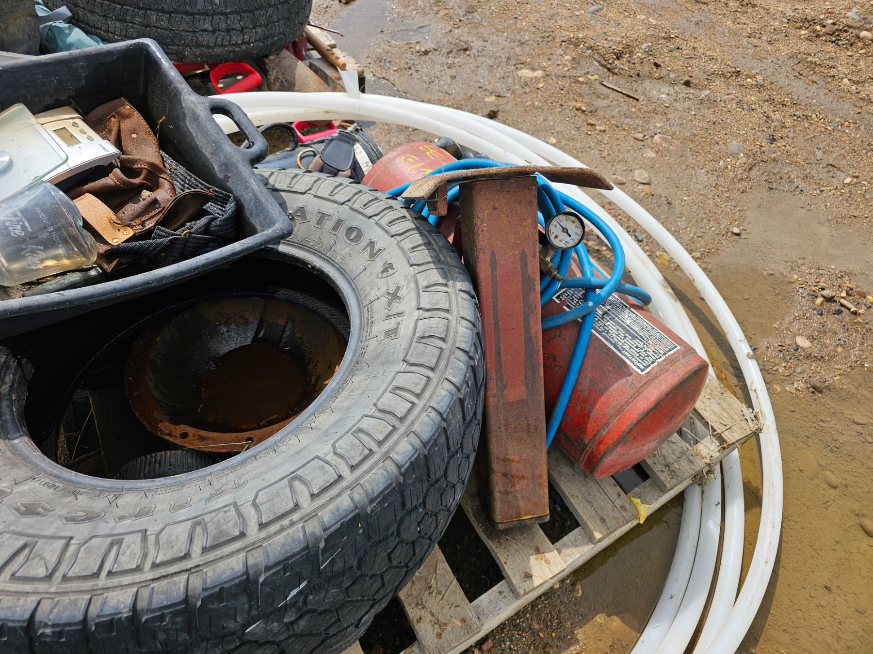 tubing, golf club set, air tank, jack foot, LT245/75R16 tire, rear diff cover, chimney piping.