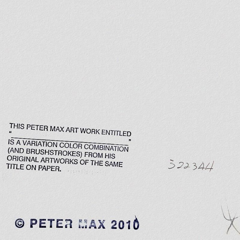 "Palm Beach Lady" is a one-of-a-kind mixed media on paper, hand signed by Peter Max. The piece comes custom framed with a backside cutout to display Peter Max Studio registration number 322344 certifying authenticity. Measures approximately 48" x 36" (frame), 36" x 24" (image). This item requires special handling and may have a longer than usual turnaround.