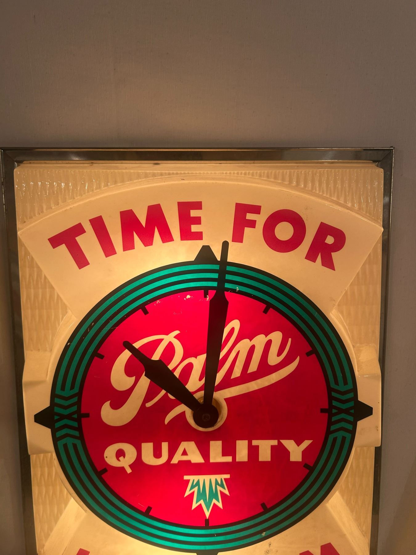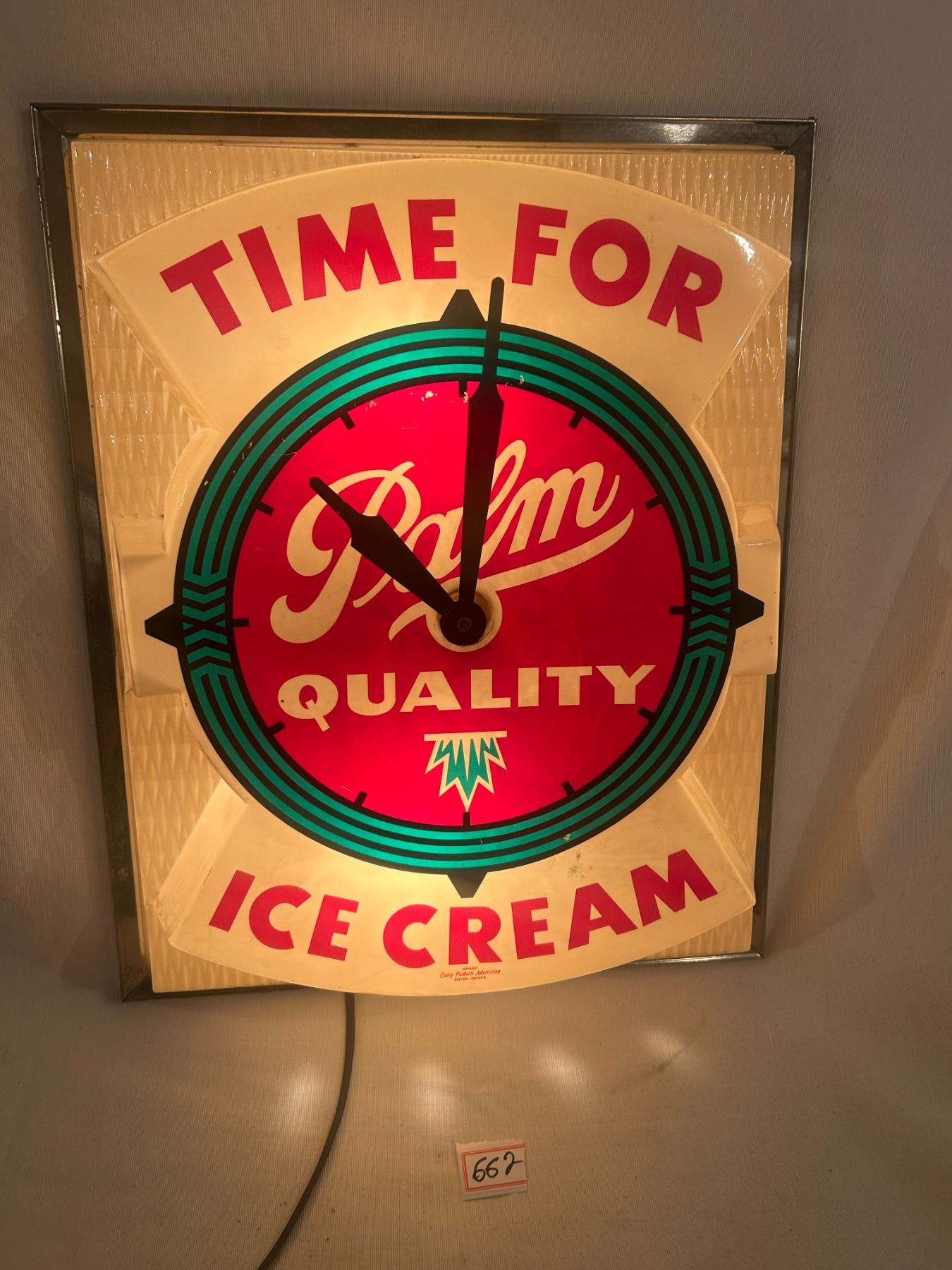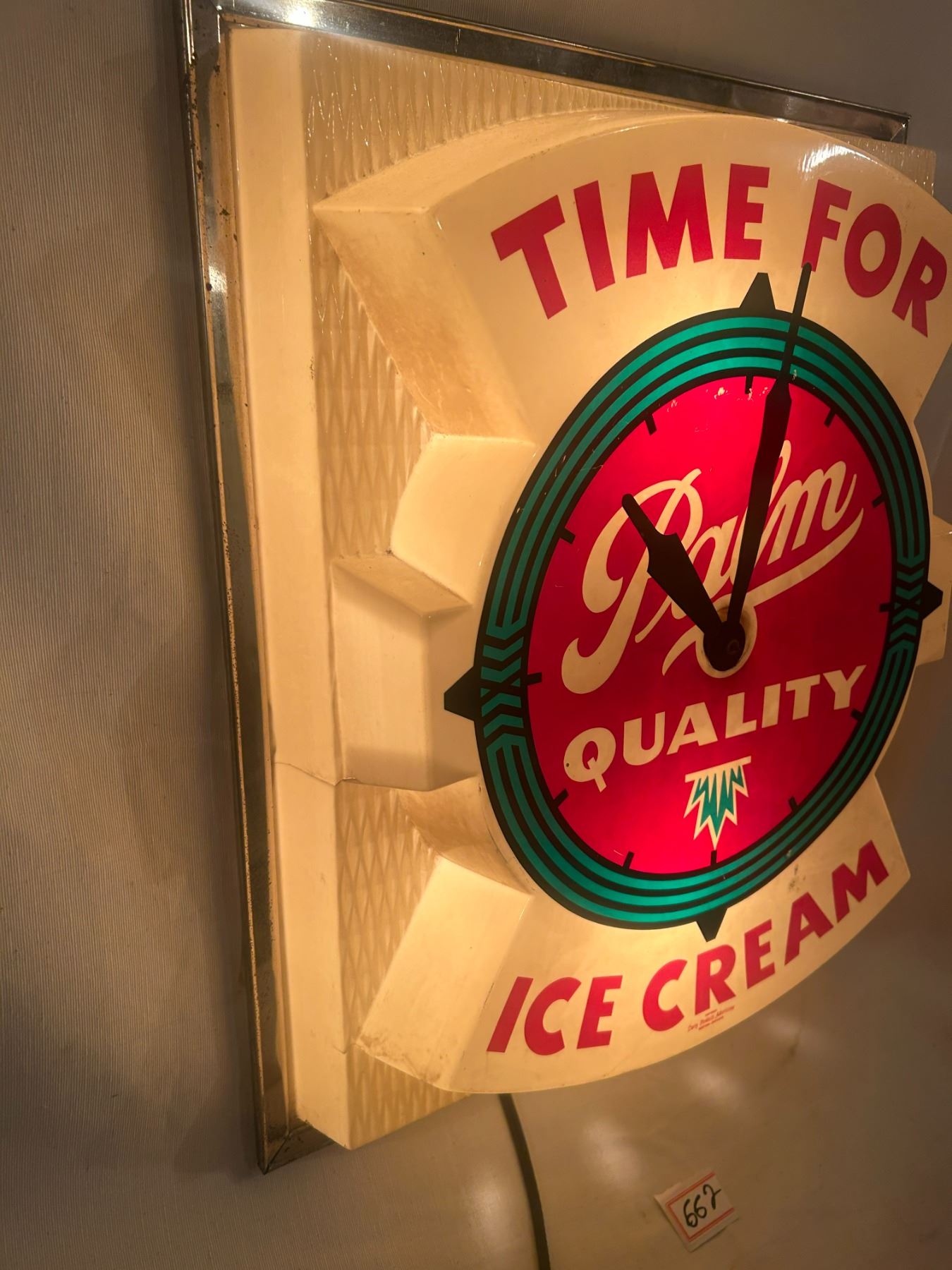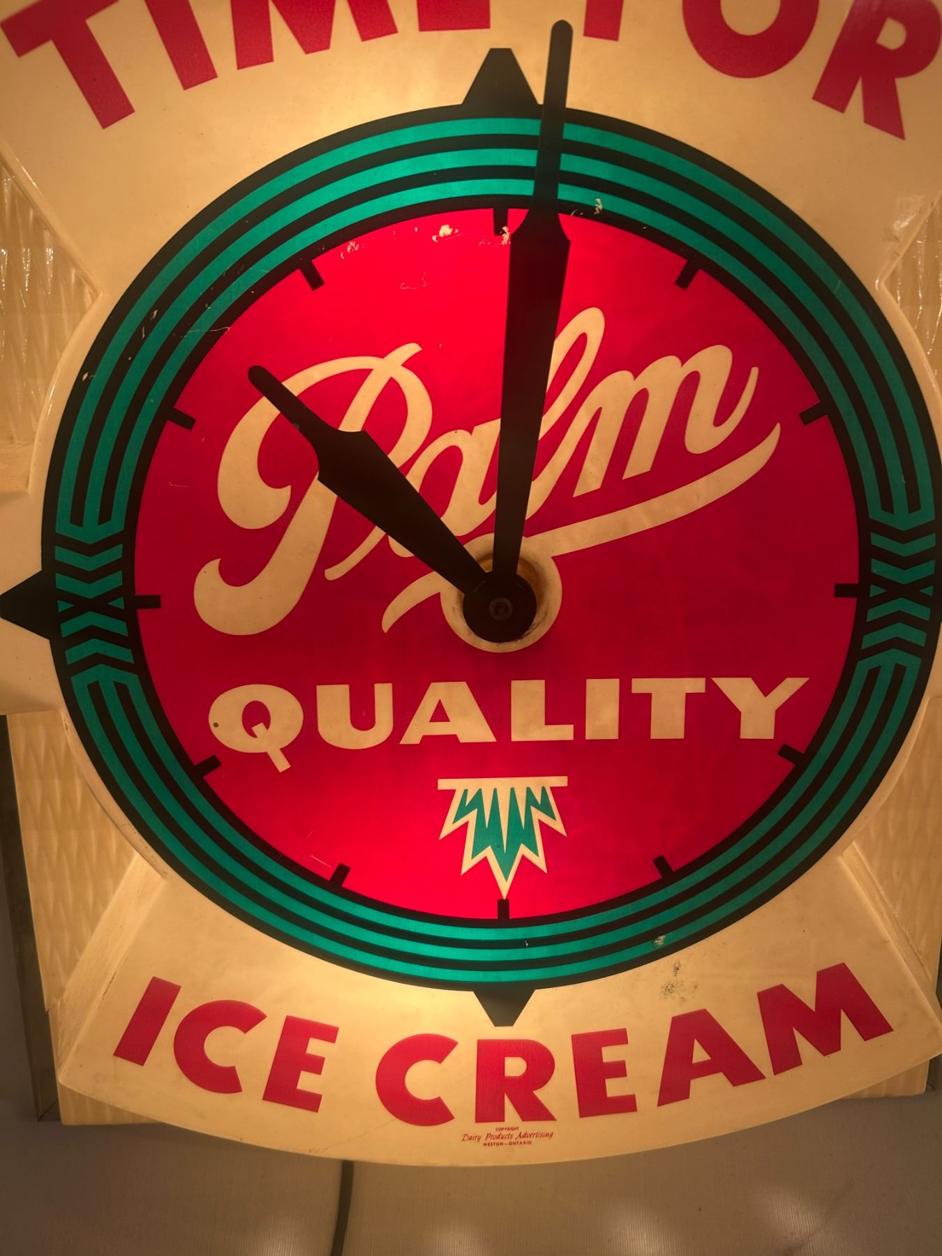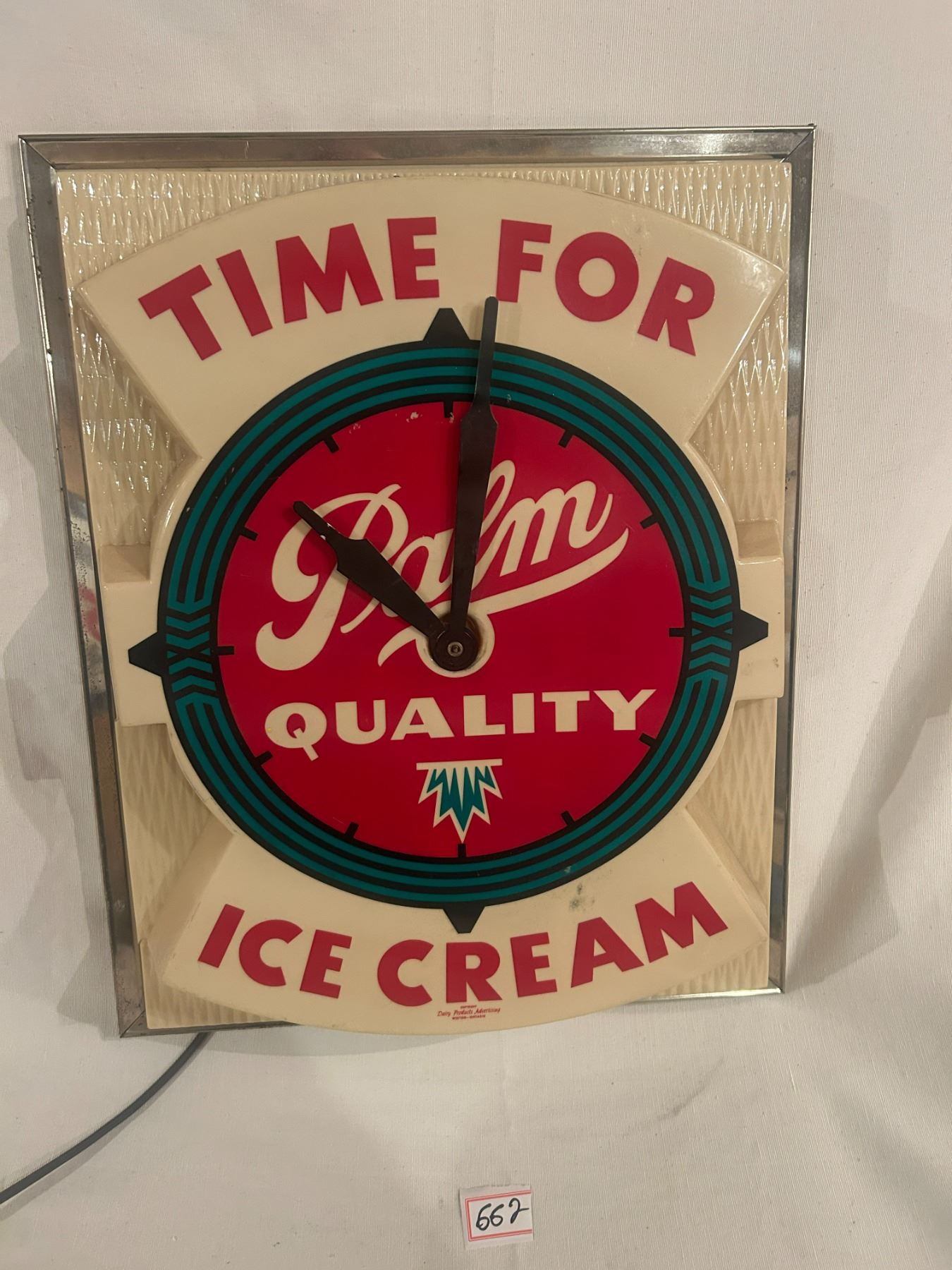 Palm Ice Cream advertising clock - working, small crack left side, 21"x7-1/2"