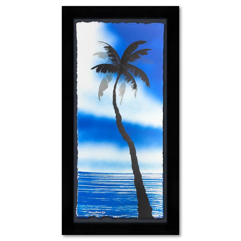 "Palm Trees" is an original painting acrylic on deckle edge paper by Wyland. Hand signed by the artist, the piece comes custom framed and with a letter of authenticity. Measures approximately 26.5" x 14.5" (framed), 22.5" x 10.5" (image). This item requires special handling and may have a longer than usual turnaround