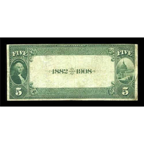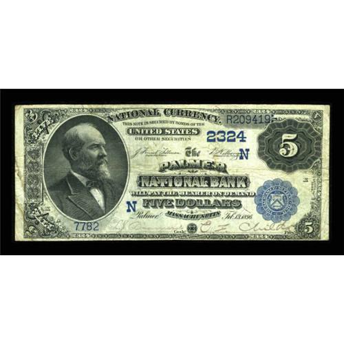 <B>Palmer, MA </B></I>- $5 1882 Date Back Fr. 534<B> The Palmer NB</B></I> Ch. # (N)2324<BR> A very scarce type from this bank. The census shows just two $5 and one $10 Date Backs. Note the fancy layout, which is most unusual to find on any Date Back. Our consignor obtained this piece from Maine dealer Frank Trask back in October of 1981. <B>Fine-Very Fine.<BR></B></I><I>From The Thomas A. Bergin Collection</B></I><BR><BR><b>Shipping:</b> Coins & Currency (<a target="_blank" href="http://www.heritageauctions.com/common/shipping.php">view shipping information</a>)