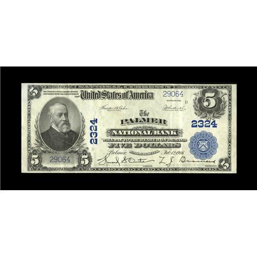 <B>Palmer, MA</B></I> - $5 1902 Plain Back Fr. 606 <B>The Palmer NB</B></I> Ch. # 2324<BR>This western Massachusetts town had only one National Bank, though it sufficiently met the needs of the community's banking needs. Remaining examples are mostly well-circulated. This example is well embossed and wholly original. We enjoy the paper quality so much, we can not stand to restrict it to a Very Fine grade. <B>Very Fine-Extremely Fine.</B></I>