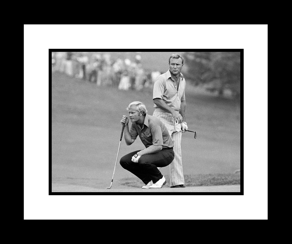 This 16x20 framed fuji crystal archival photo is entitled "The King and the Golden Bear." Jack Nicklaus kneels as Arnold Palmer looks over his shoulder while they study a putt on the 18th green at Laurel Valley Golf Club at the PGA National Team Championship in Ligonier, PA. The photo was taken on July 31, 1972.Includes a Certificate of Authenticity.