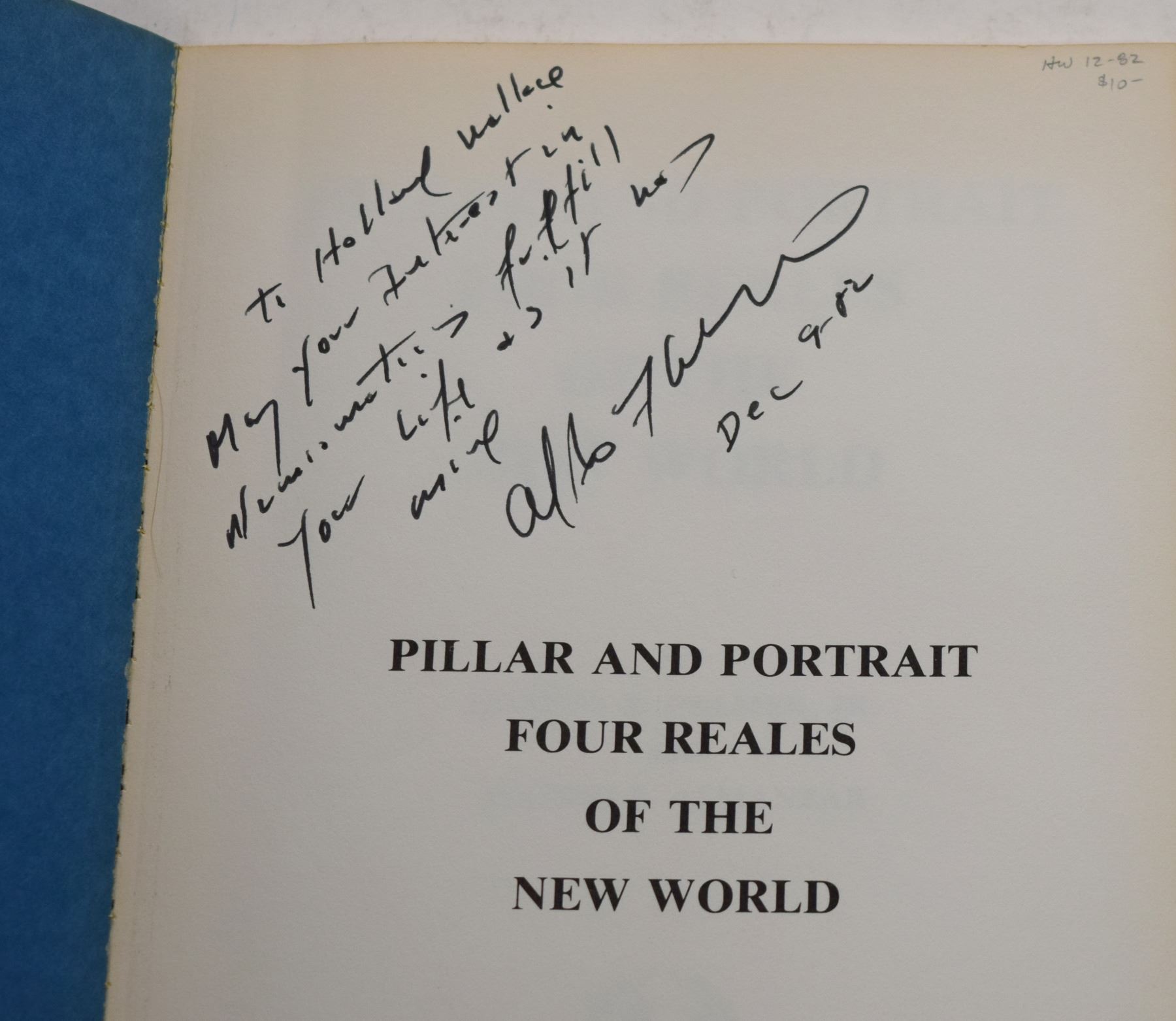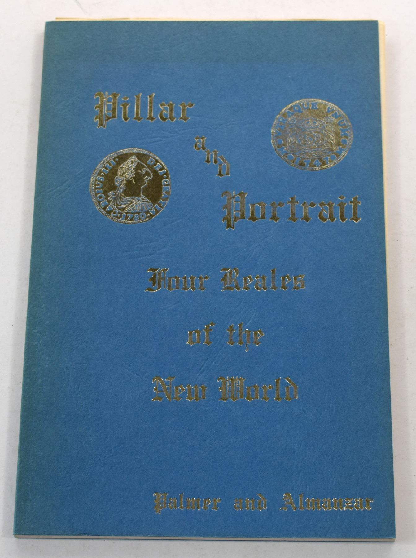 Palmer, Jr. , Darwin B. & Alcedo F. Almanzar. (Signed) PILLAR AND PORTRAIT FOUR REALES OF THE NEW WORLD. Almanzar's Coins of the World. 1982. 12mo, 70 pages; Softcover; Limited edition 131 of 500 copies; Inscribed by the author; this book is a catalog and price guide to the pillar and portrait 4 reales of colonial Spain. A scarce work. Subject: Coinage - Spain - Colonial