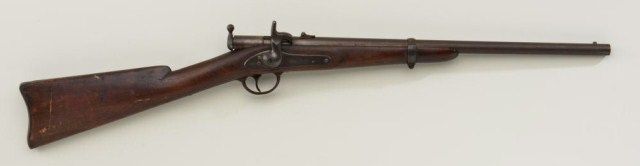 Palmer bolt action breech loading carbine by “E.G. Lamson & Co.” of Windsor Vt. in 50 caliber rim fire, one of approx 1,000 produced. Refer Flayderamn 9B – 080. The carbine remains in good condition with abrown patina finish and non inspected stock. The stock shows some gouges, mars, dings and losses and would be rated as fair to good. The markings are good and the metal shows some slight erosion and pinprick pitting.The saddle ring has been removed and the bore is rough. The Palmer carbine arrived too late for the Civil War and this is one of the few examples that appear to have been used on the early frontier. Est.;$900-$1,800.