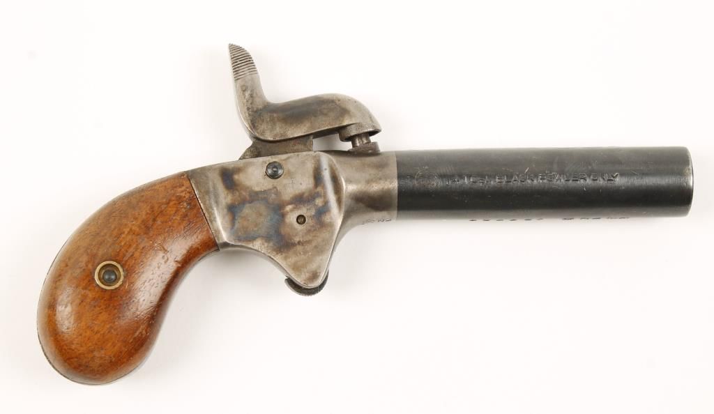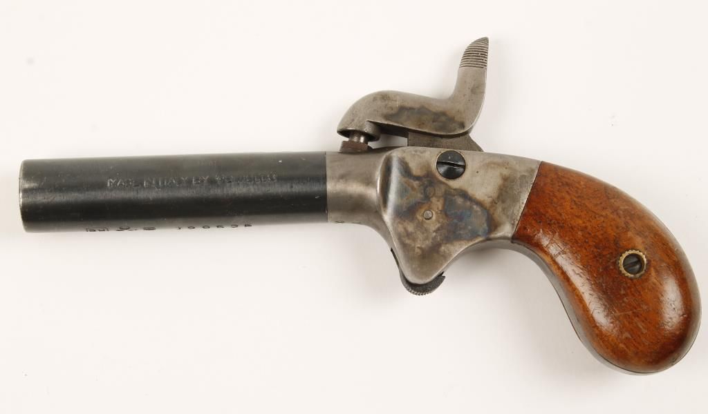 Italian made modern reproduction single shot "muff" derringer with 2-1/2" blued barrel. Case colored frame and hammer, plain wood teardrop grips, spur trigger and no sights. Good working action. Condition: Very good showing light scratches on grips.
