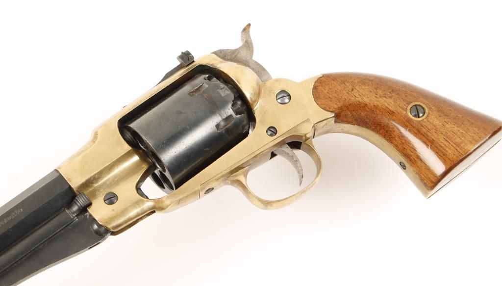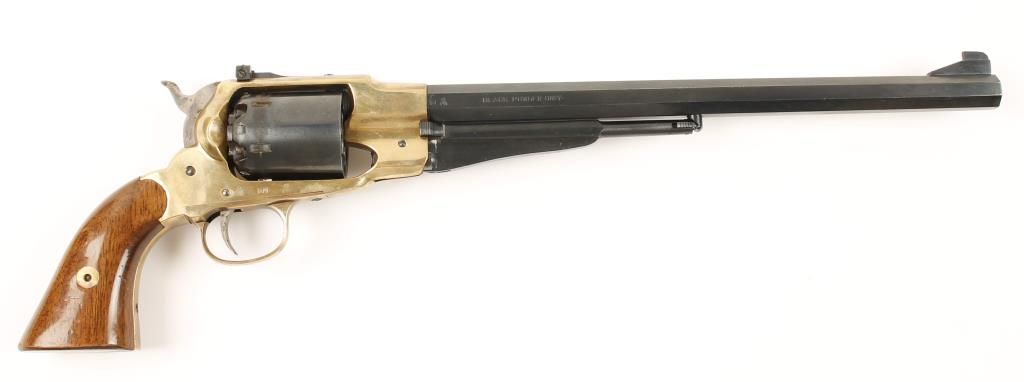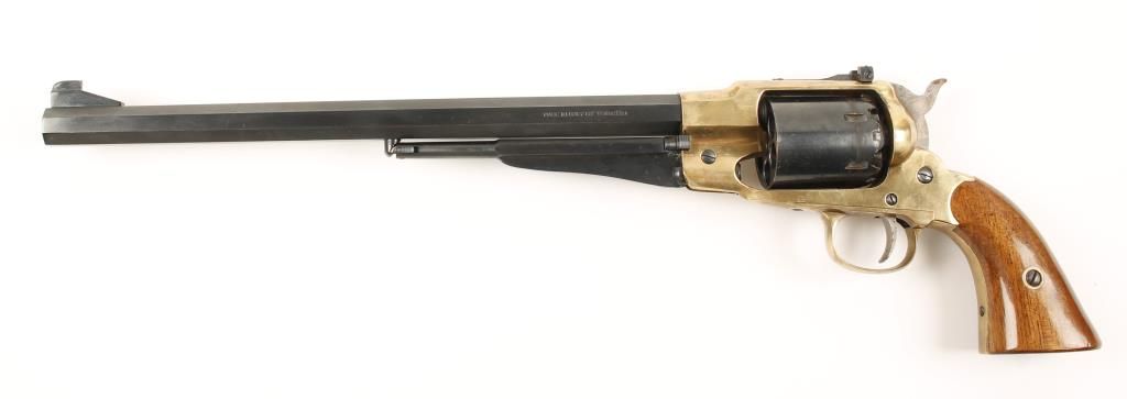 Replica black powder single action 6-shot pistol. 12" blued octagon barrel. Blued loading lever and cylinder. Case colored hammer and trigger. Brass frame and trigger guard. Not cut for a shoulder stock. Condition is good with some minor pitting and a drag line. *Antique Firearm*