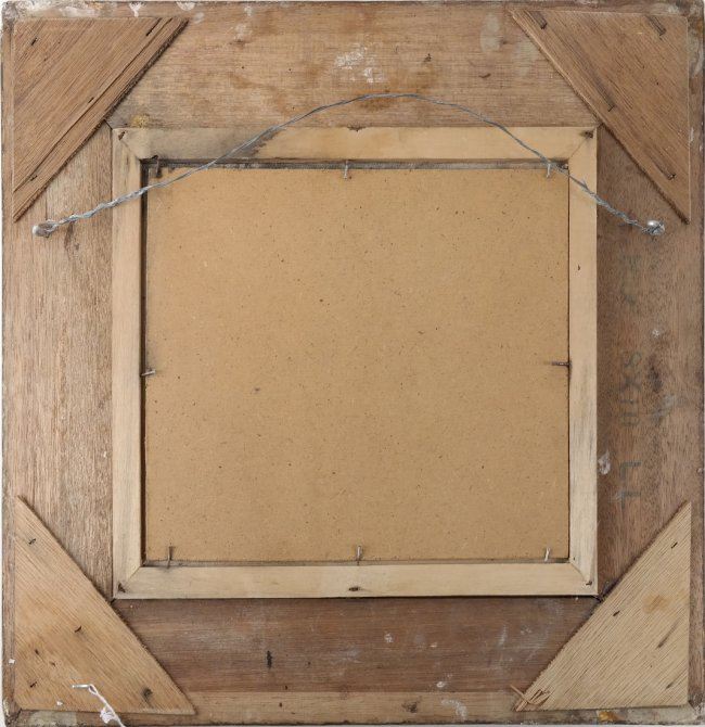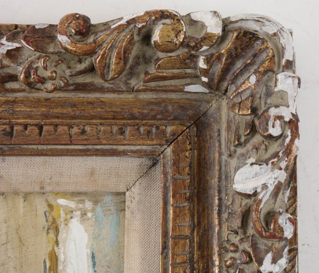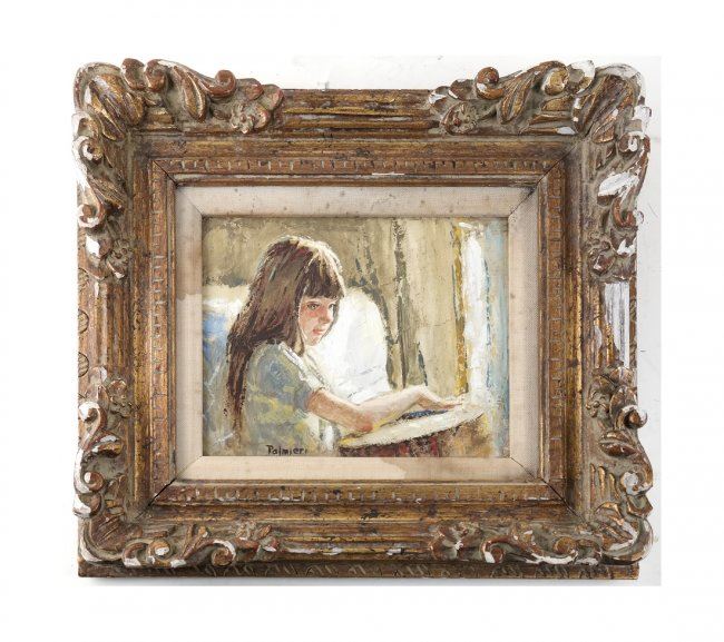 Framed oil on panel depicting a girl seated at a drum. [Art: 8" x 10"; Frame: 15" x 17"]. In good condition.