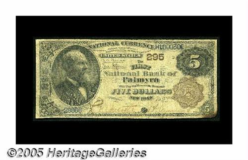 <B>Palmyra, NY</B></I> - $5 1882 Brown Back Fr. 466 <B>The First NB</B></I> Ch. # 295<BR>Vice President Seymour signed this note along with cashier R.M. Smith. Mr. Smith would later go on to hold down both the cashier's and president's positions at the same time for this bank. The lower right-hand corner tip exhibits charring. <B>Very Good.</B></I>