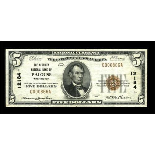 <B>Palouse, WA</B></I> - $5 1929 Ty. 1 <B>The Security NB</B></I> Ch. # 12184<BR> Despite receiving its charter in 1922, this bank elected to issue Series 1929 examples only. Just a dozen examples are known, with not one in the current census grading higher than Fine-Very Fine. Fortunately for collectors, this newly discovered example is considerably nicer than any previously listed, grading a strong <B>Extremely Fine.</B></I> Expect bidding to easily reach and possibly well exceed our likely conservative estimate of...<BR><I>From The Walla Walla Collection</B></I><BR><BR><b>Shipping:</b> Coins & Currency (<a target="_blank" href="http://www.heritageauctions.com/common/shipping.php">view shipping information</a>)