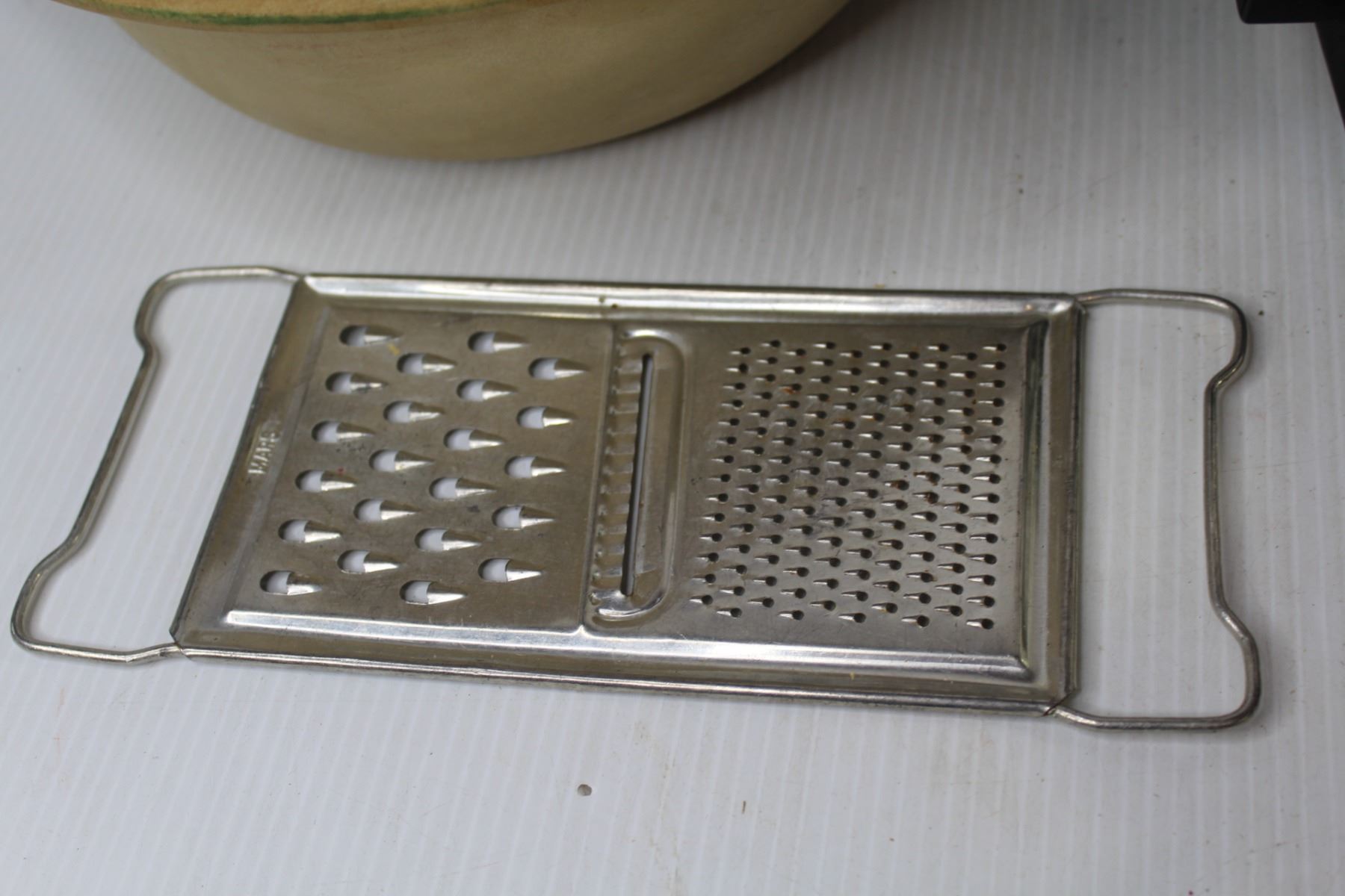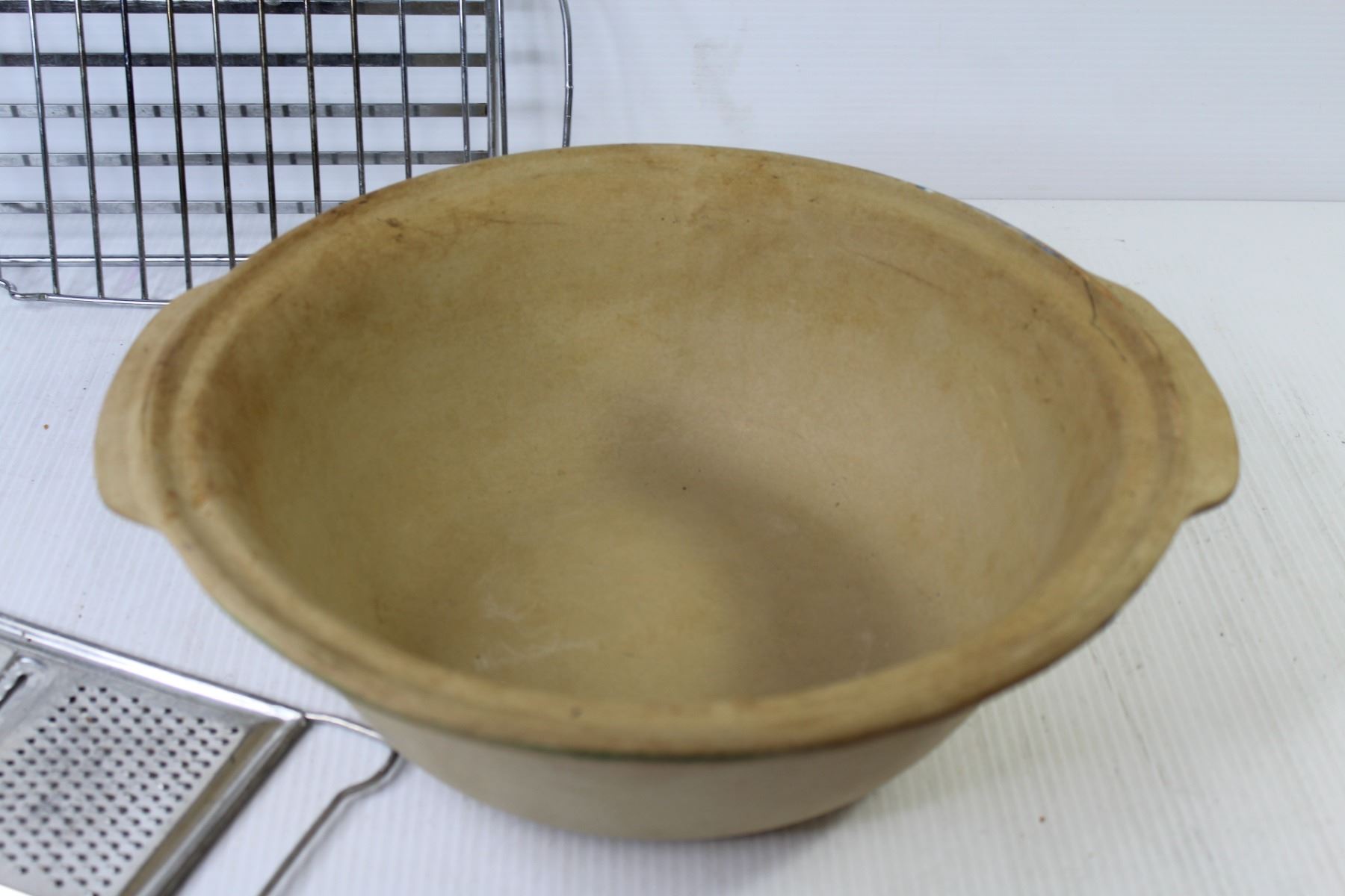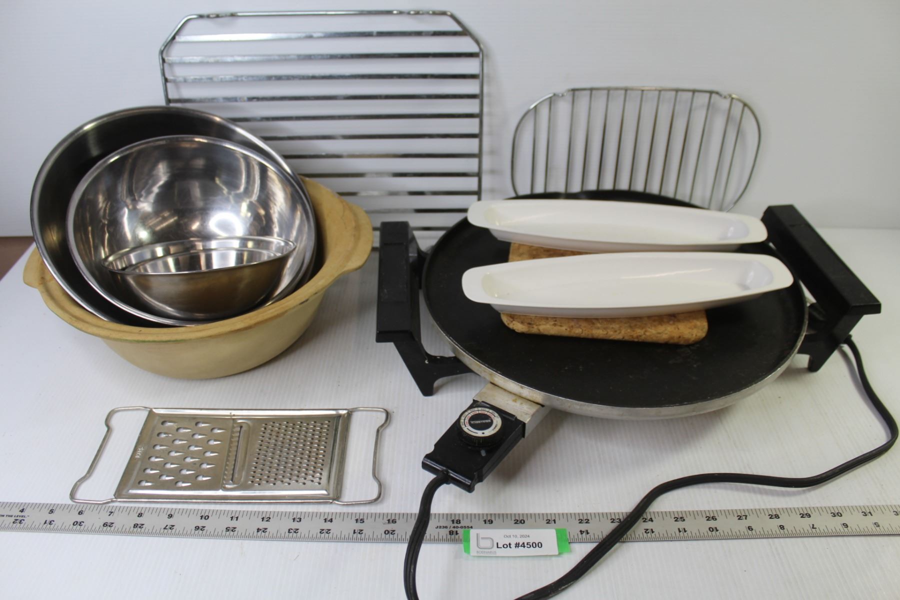 Pampered Chef Large Baking Bowl - (4) Stainless Bowls - Toastess Electric Grill (working) - Cooling Racks - Food Grater - (2) Plastic Dishes - Cork Pot Holder