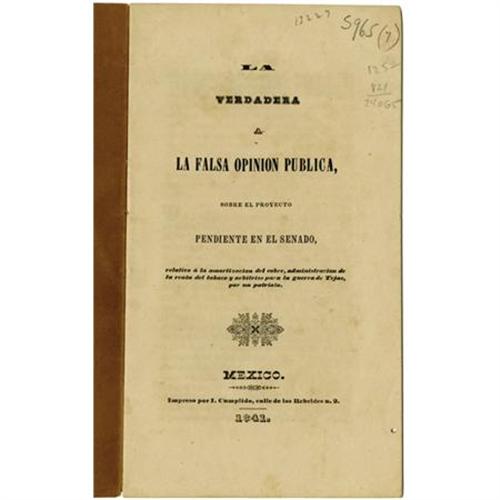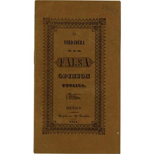 <B>Pamphlet,</B></I> <B><I>La Verdadera a la Falsa Opinion Publica, sobre el proyecto Pendiente en el Senado, relativo a la amortizacion del cobre, administracion de la renta del tabaco y arbitrios para la guerra de Tejas, por un patriota.</B></I></B></I> 15 pages, octavo, 4.5" x 7.75", (Mexico: Impreso por I. Cumplido, calle de los Rebeldes n. 2, 1841) in titled wraps. Dated at end April 12, 1841, and signed "<I>Un Patriota</B></I>", this pamphlet was part of a larger series of works concerning the proposal to the Mexican Congress early in the year 1841, by a group known as Comisiones Unidas de Hacienda y Tejas, of a law to help remedy the then deplorable state of Mexican government finances. Though the Federalist revolt under Canales, in which Texans were prominent, had been put down the previous fall and the Texan Santa Fe Expedition was not to start until June, the "war with Texas" was used by the Mexican government as a battle cry in their campaign for increased revenues. One tiny hole at bottom right, wraps evenly toned, else very good. <I>From the Darrel Brown Collection.</B></I><BR><BR><B>Reference: </B></I>Streeter 965 no. 7; Eberstadt 162:865<BR><BR><b>Shipping:</b> Flat Material, Small (<a target="_blank" href="http://www.heritageauctions.com/common/shipping.php">view shipping information</a>)