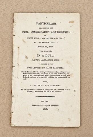 Pamphlet entitle Particulars respecting the trial condemnation and execution of Major Henry Alexander Campbell for killing in a duel, Captain Alexander Boyd. Printed Boston by Joshua Cushing, 1808. Pages intact, binding loosening, small tatters and acid burns. From the William R. Orbelo Collection. Est: $250 - $500