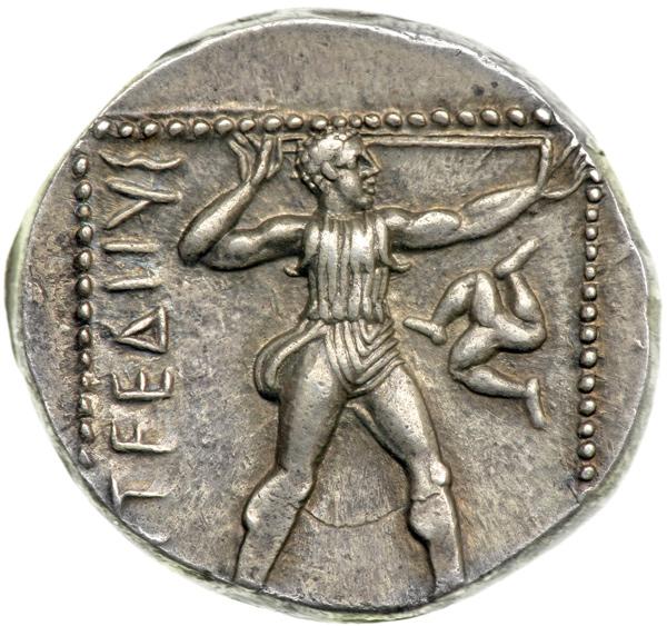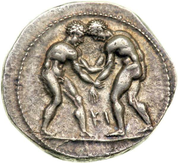 Pamphylia, Aspendos, 370-333 BC. AR Stater (10.96 g). Two athletes wrestling, grasping each other's arms. Reverse: Slinger advancing right, about to discharge his shot; in right field, triskelion. SNG von Aulock 4557 (this obverse die); SNG Cop 226. About Extremely Fine with excellent facial detail.