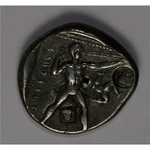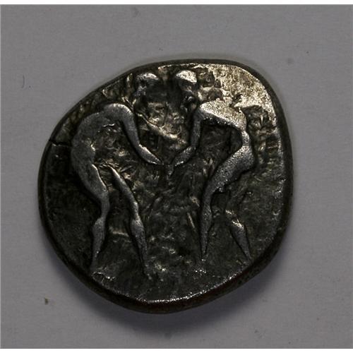 <B>Pamphylia, Aspendos.</B></I> Ca. 400-380 B.C. AR stater (22 mm, 10.75 g). Two wrestlers grappling / Slinger to right; triskeles in field; c/m's: lion's head facing and lion's scalp from above. Teken Series C; SNG France 52-7. Toned VF, obverse die deteriorated, test punch on reverse.