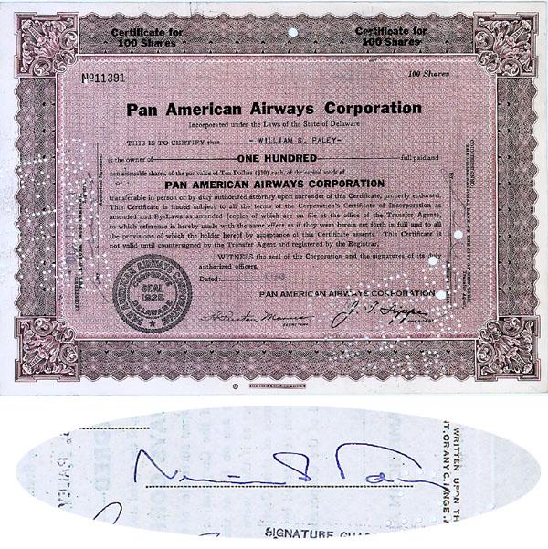 1933, Delaware. Stock certificate for 100 shares of Pan American Airways Corp. Purple/Black. Issued to and signed on verso by WILLIAM S. PALEY, Broadcasting Executive, founder of the Columbia Broadcasting System (CBS). Facsimile signature of Juan Trippe. Punch cancellations not affecting signature. Extremely Fine.