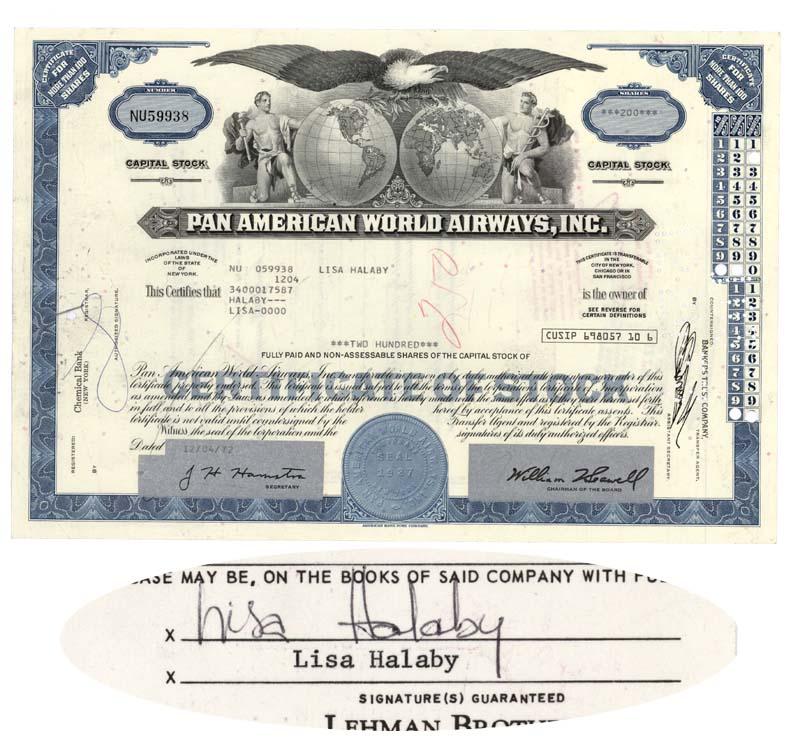 1972, New York. Stock certificate for 200 shares. Blue/Black. Engraved vignette of two globes flanked by allegorical male figures, spread eagle at top. Issued to and signed on the accompanying transfer document by Lisa Halaby, Queen Noor of Jordan (b. 1951) The fourth wife and widow of the late King Hussein of Jordan. She is the daughter of American Najeeb Halaby, a former CEO of Pan-American World Airways, one time head of the Federal Aviation Administration, and former Deputy Assistant Secretary of Defense, and his first wife, Doris Carlquist. She is the current president of the United World Colleges movement. This certificate was sent to her while she was a student at Princeton. A highly unusual item. Punch and pen cancellations not affecting her signature. Fine.