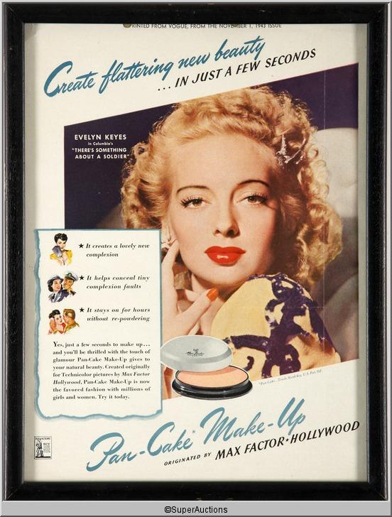 From the Max Factor Collection / Framed Pan-Cake Make-Up Advertisement 1944 Featuring Evelyn Keyes in Columbia's "There's Something About A Soldier" / Reprinted from Vogue November 1, 1943 Issue / {9 /12" L x 12 /12" H}