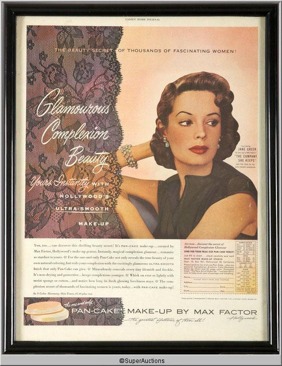 From The Max Factor Collection / Framed Pan-Cake Make-Up Advertisement 1951 Featuring Jane Greer co-starring in RKO Radio's "The Company She Keeps" from the Ladies' Home Journal / {11" L x 14" H}