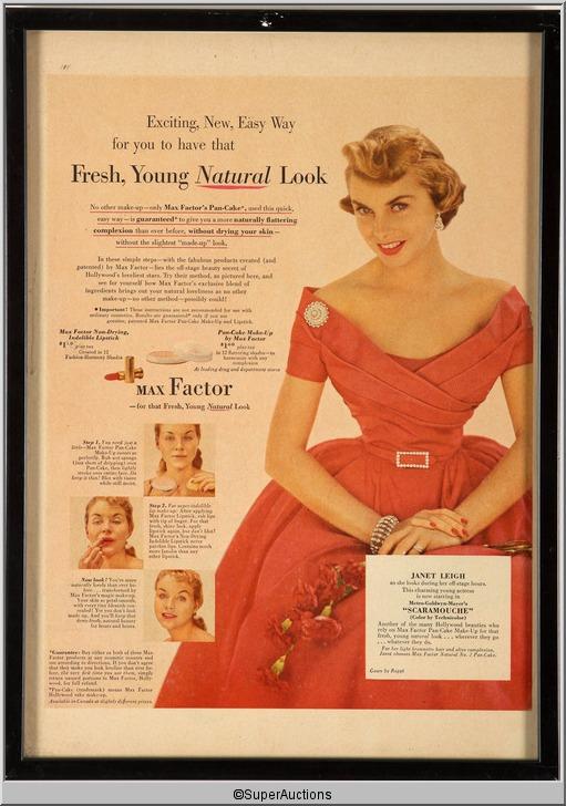 From the Max Factor Collection / Framed Pan-Cake Make-Up Advertisement Featuring Janet Leigh now starring in Metro-Goldwyn-Meyer's "Scaramouche" / {10 1/2" L x 14 1/2" H}