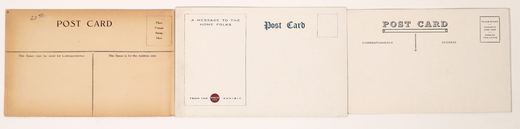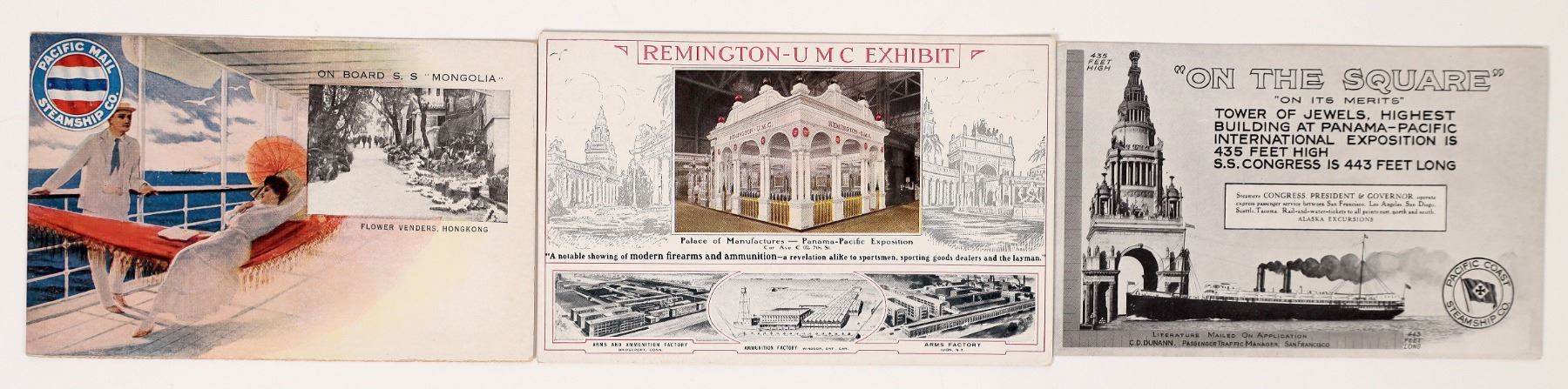 3 Pan Pacific related rare advertising postcards. Pacific Mail Steamship, Remington-UMC, On the Square. California San Francisco