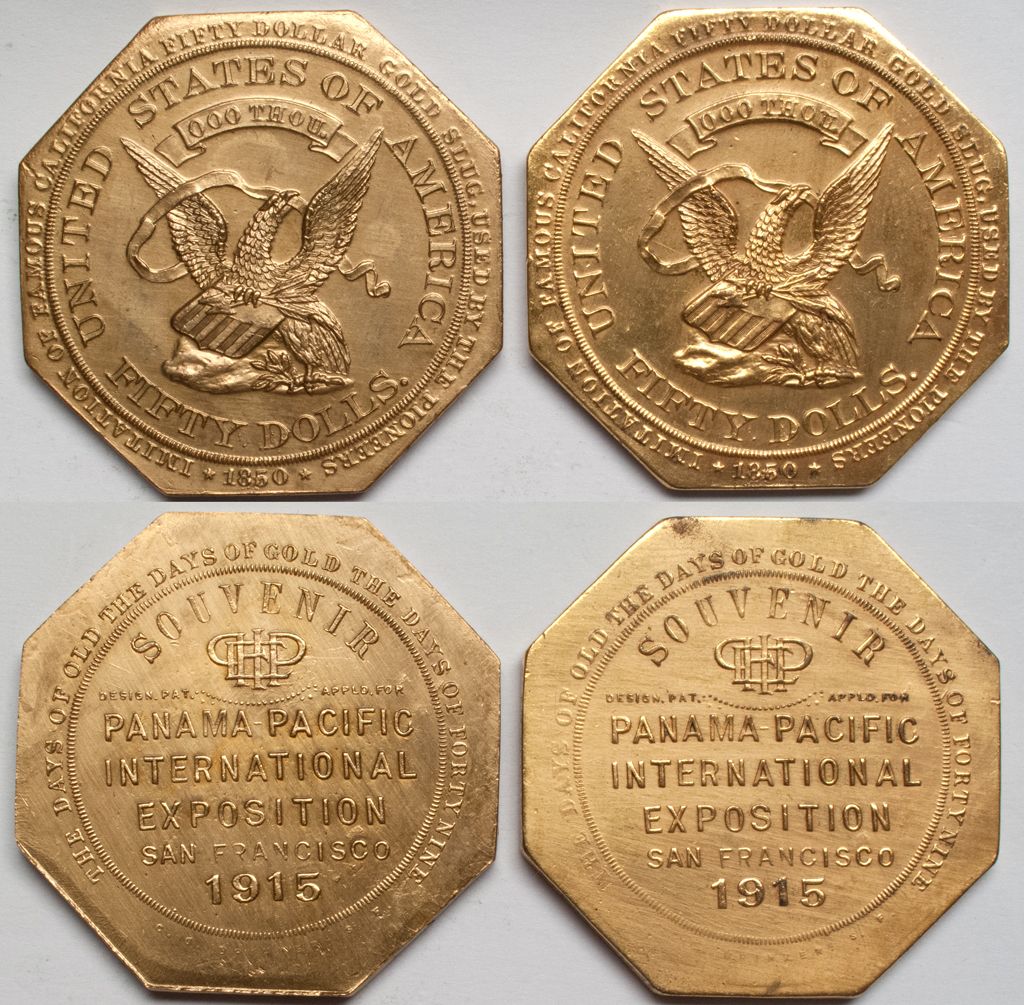 Lot of two slug facsimiles from the 1915 Panama Pacific International Exposition. Reverse 'SOUVENIR PANAMA PACIFIC INTERNATIONAL EXPOSITION SAN FRANCISCO 1915.Weber #31 and Bill Weber Collection. City: San FranciscoCounty: State: CADate: 1915