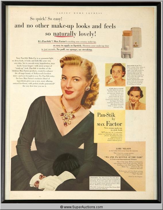 Framed Pan-Stik Make-Up Advertisement 1952 Featuring Lori Nelson Now Appearing in "Ma and Pa Kettle At The Fair" from the Max Factor Collection {11" L x 14" H}