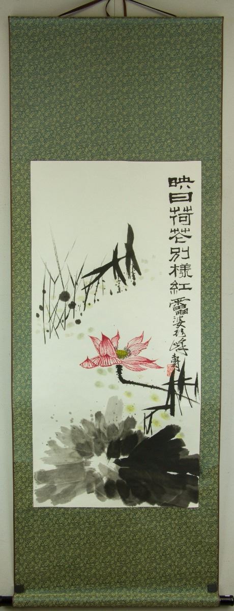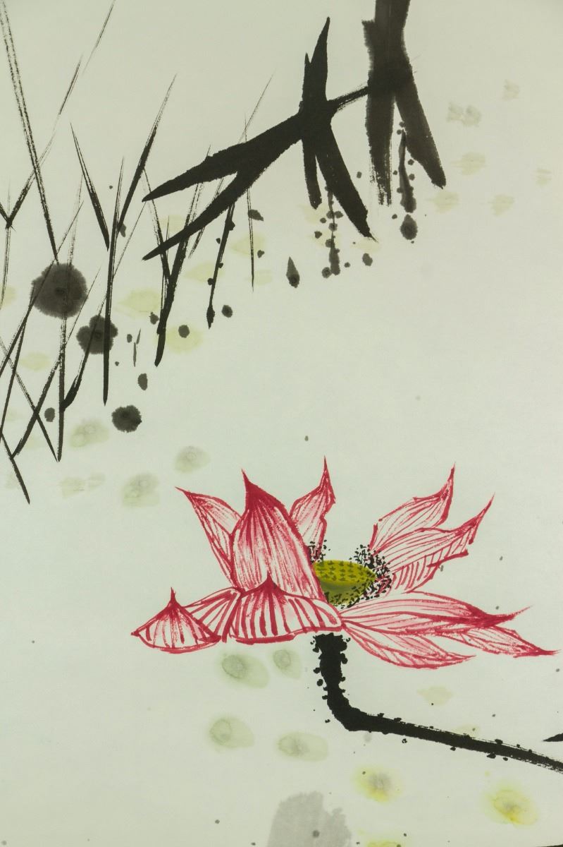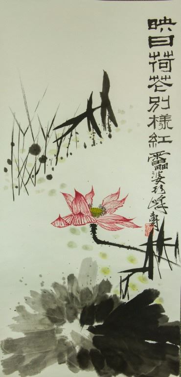 Lotus and lotus leaf; Chinese ink and watercolour on paper; hanging scroll; signed Pan Tianshou and inscribed with one seal; 168 cm × 60 cm