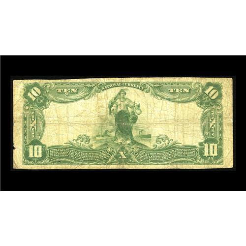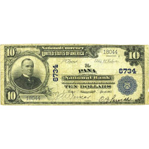 <B>Pana, IL</B></I> - $10 1902 Plain Back Fr. 624 <B>The Pana NB</B></I> Ch. # 6734<BR>A <B>Fine</B></I> example with stamped signatures still quite strongly visible. While two issuers were located here, this was the only one to issue the Third Charter Period design types. It failed in 1930, leaving the community bereft of a federally chartered bank. One can only speculate at the severe economic dislocations and destruction of wealth that must have been caused in these smaller communities by the succession of bank failures that took place during the Depression.