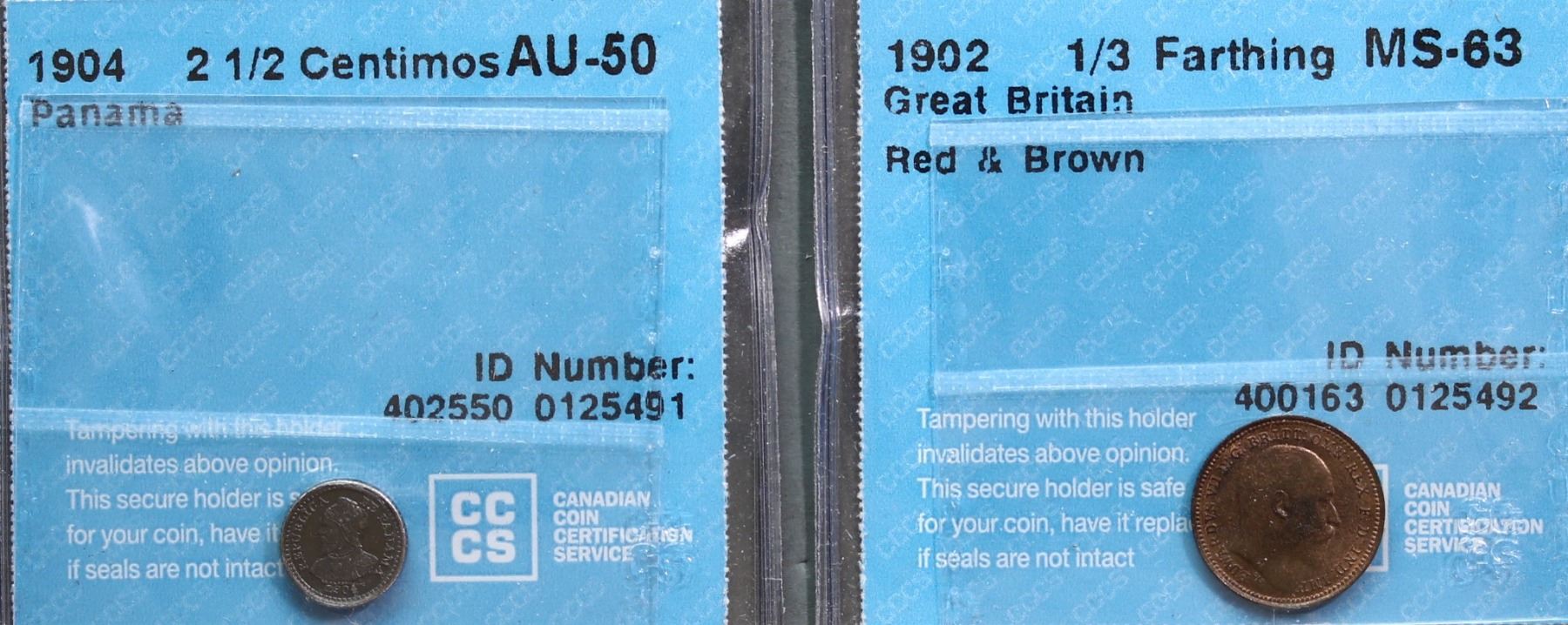 Panama 1904 2 1/2 Centimos CCCS AU50 & G.B. 1902 1/3 Farthing CCCS MS63. Lot of 2 coins.
