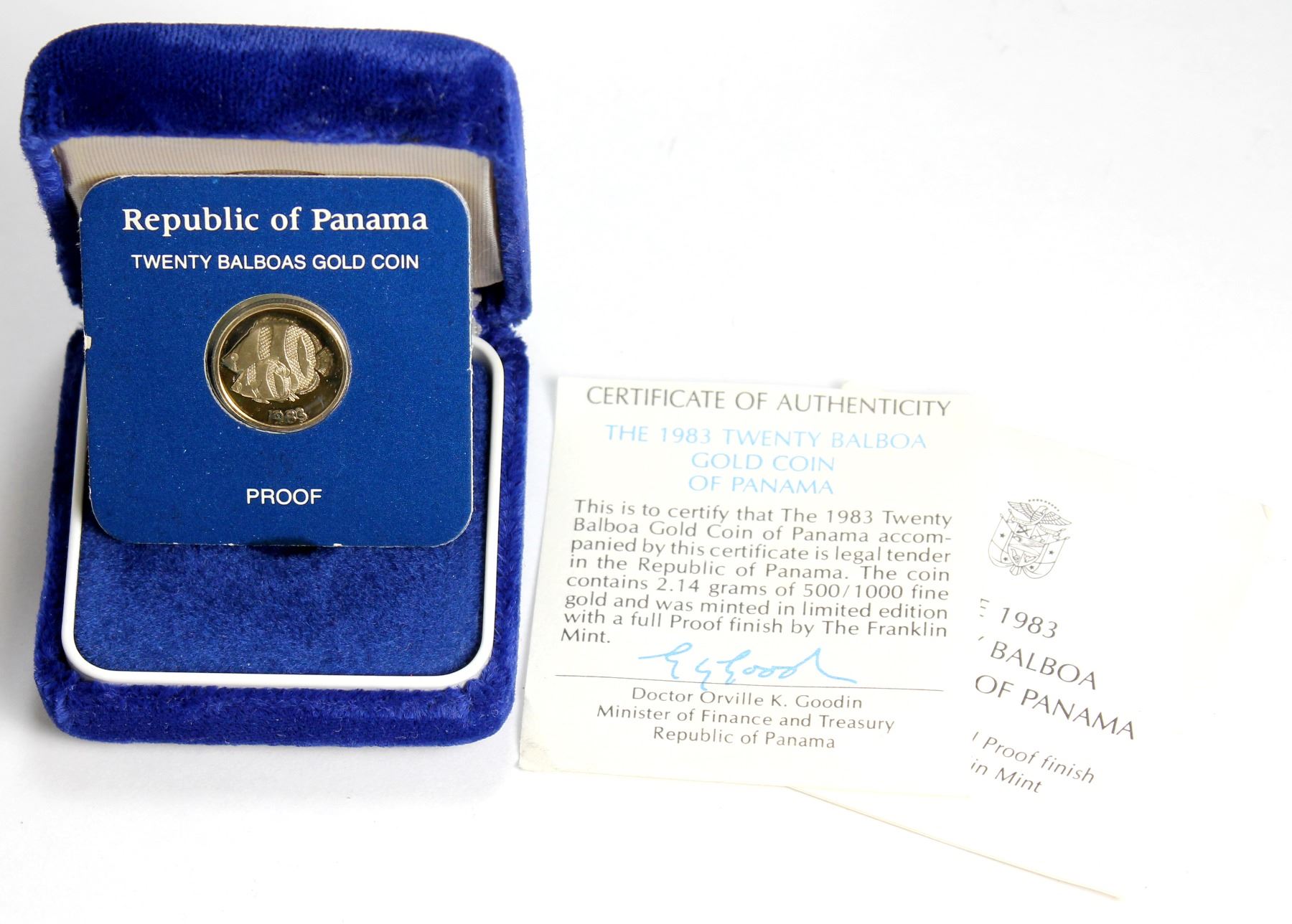 Panama 1983 20 Proof Gold Balboa, Produced by the Franklin Mint. Limited Mintage 1671! Coin weighs 2.14g of .500 Pure gold (0.0344oz)