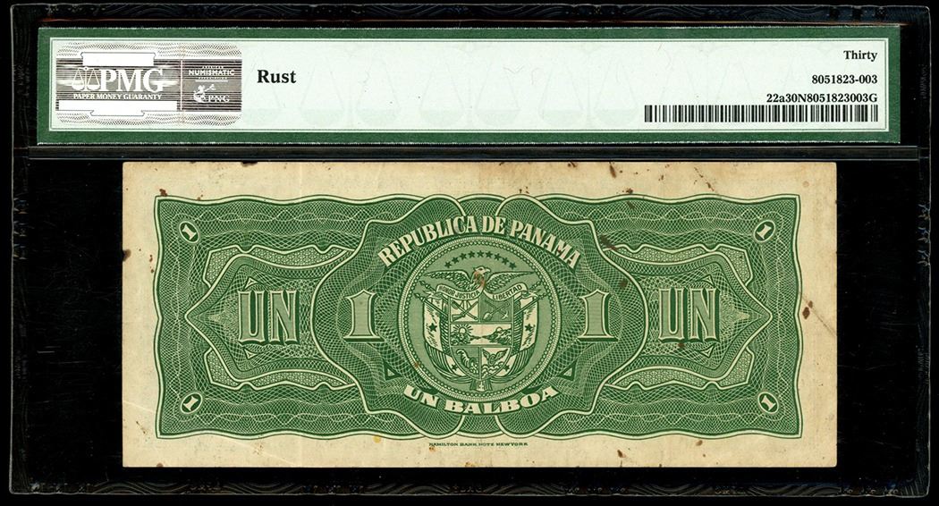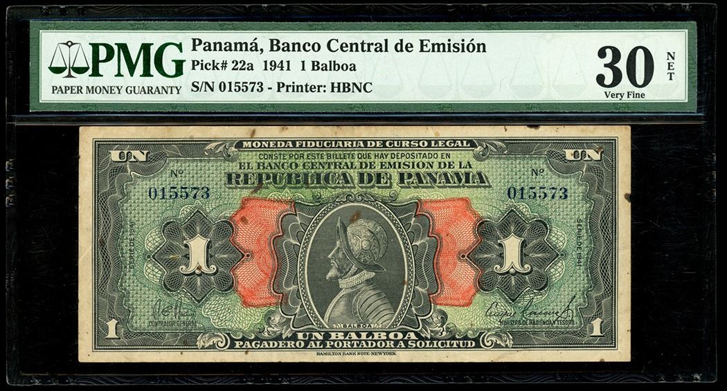 Panama, Banco Central de Emision, 1 balboa, series of 1941, serial 015573, PMG VF 30 Net. Pick-22. An issued example of the "Arias" or Seven Days balboa note which was heavily redeemed and destroyed following a coup. Circulated with some rust spotting noted, still colorful undertones on this desirable type. Please use this link to verify the certification number