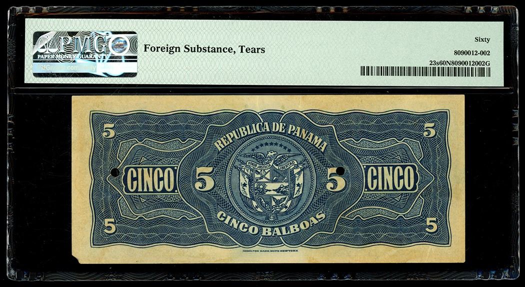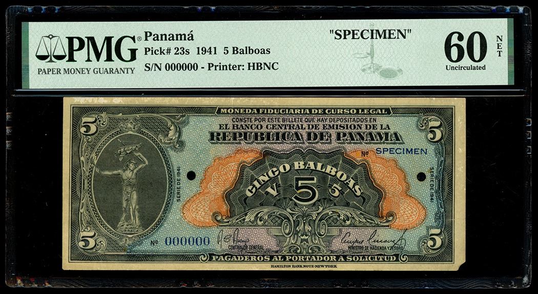 Panama, Banco Central de Emision, 5 balboas specimen, series of 1941, PMG UNC 60 Net. Pick-23s. Colorful specimen note for the short-lived "Arias" series of bank notes which were only issued for seven days in Panama before a coup forced their redemption and destruction. Though there is a residue over the note, the ink colors remain especially strong. There is a rather hidden tear in the center of the top and a small corner piece is missing. Two punch hole cancellations are noted. Please use this link to verify the certification number