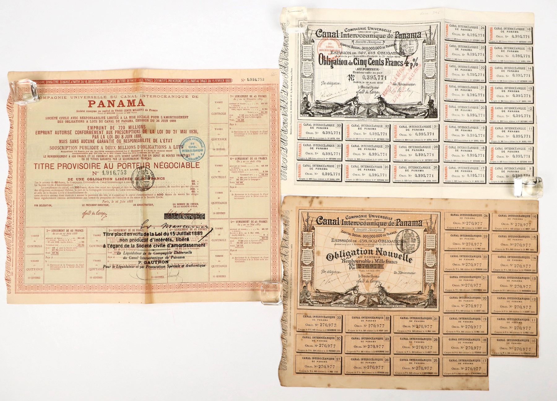 Lot of 3. I/U. Issued 1886 &88. Two have vignettes "North America-South America" allegorical females with canal in background. All have coupons attached. VF.